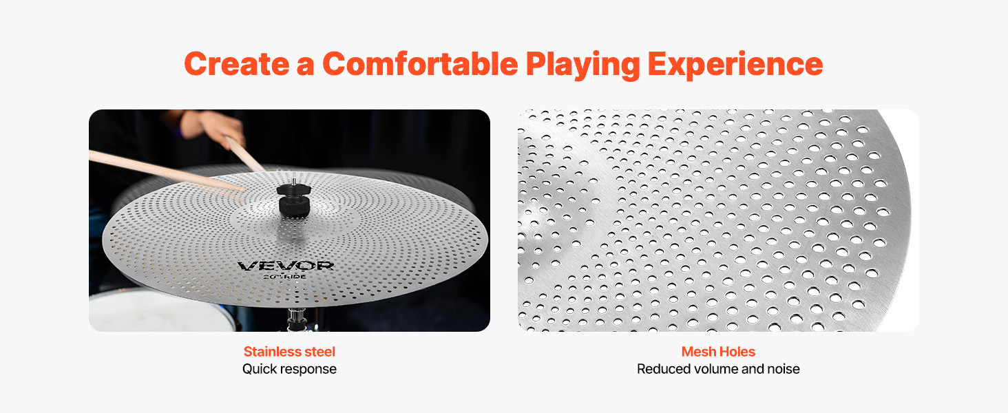 Naša sada bubeníckych činelov je vyrobená z odolnej zliatiny a má hrúbku 0,7 mm, čo zaručuje rýchlu odozvu a zároveň pevnosť. Drážky a sieťované otvory zaisťujú čistý, jasný tón, vďaka čomu si môžete vychutnať hladké a príjemné hranie.