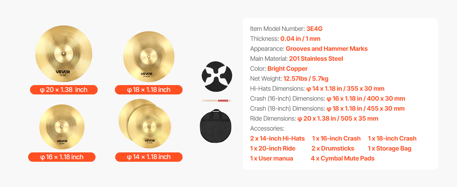 Táto činelová sada obsahuje 4 činely: 14-palcový Hi-Hat, 16-palcový Crash, 18-palcový Crash a 20-palcový Ride. Okrem toho 2 paličky, 1 úložnú tašku a 6 tichých podložiek. Vďaka jasným tónom, rôznym štýlom a odolnosti je skvelý pre začiatočníkov!