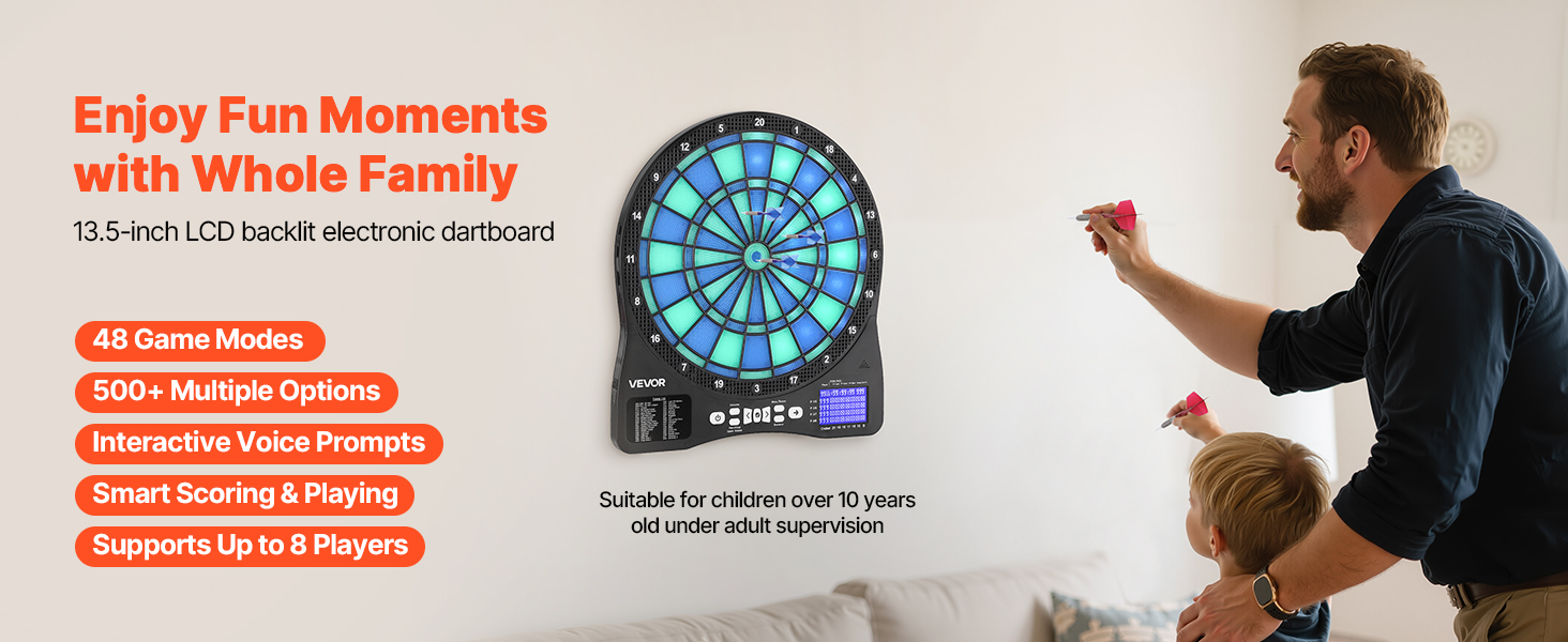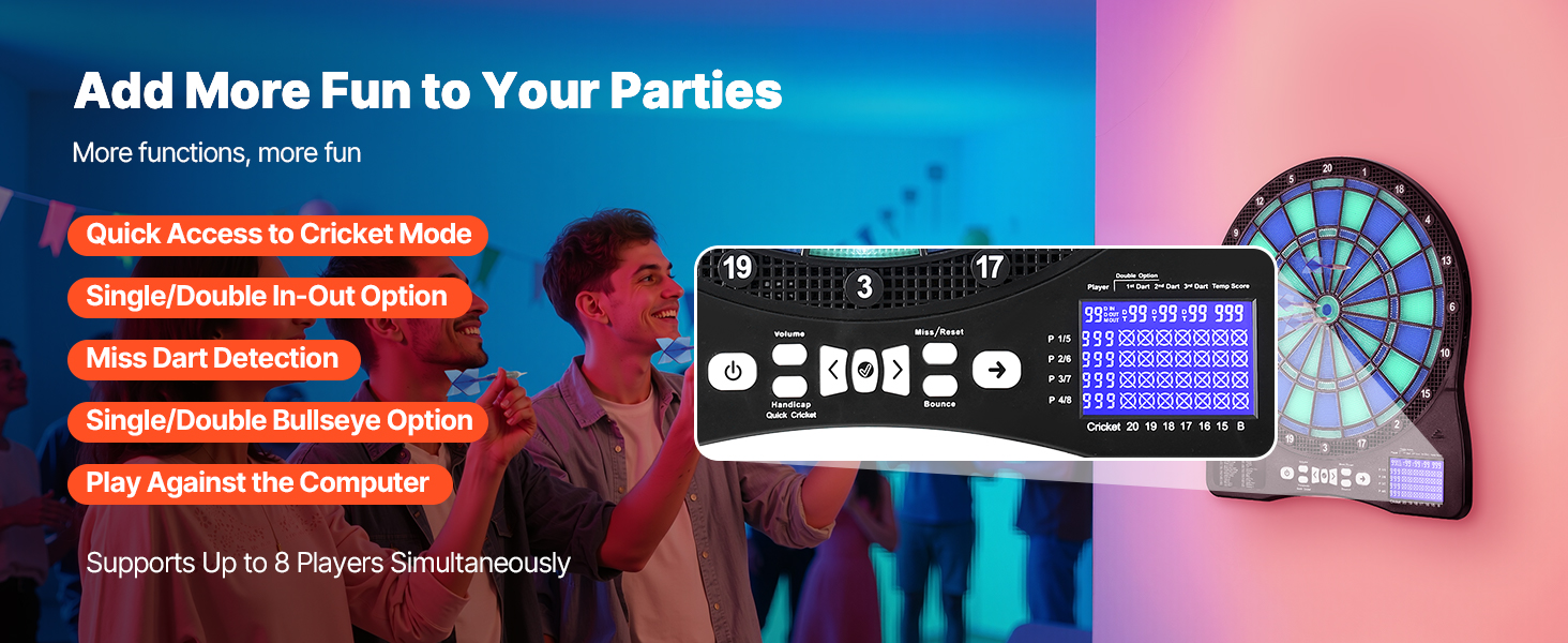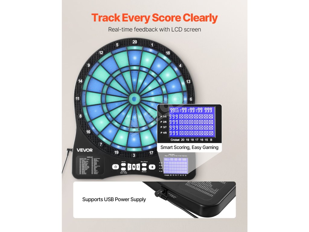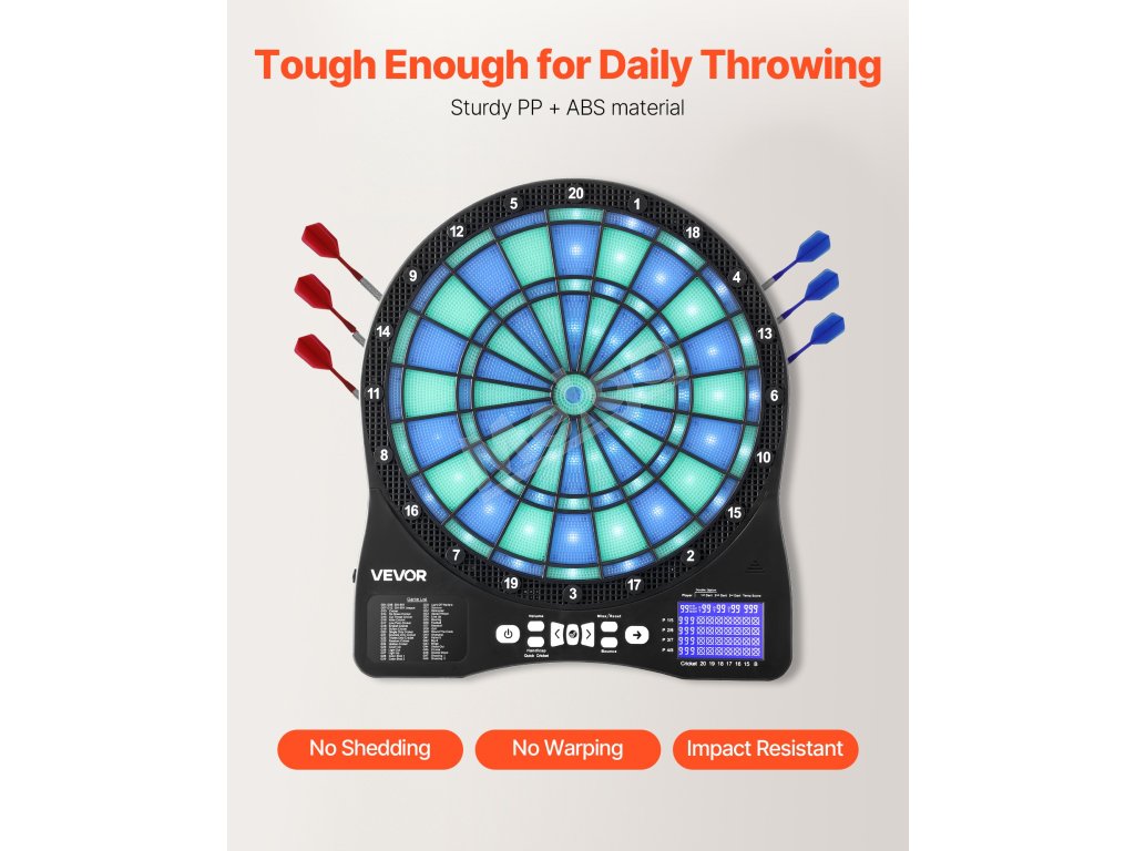 Tento elektronický šípkový terč obsahuje 48 herných režimov a viac ako 500 herných kombinácií, ktoré podporujú až 8 hráčov. S cieľovou plochou s podsvietením LED a obrazovkou LCD s bodovaním, ktorá zobrazuje skóre v reálnom čase a priebeh kola pre presné zásahy, je ideálna na rodinné stretnutia, zábavu v kancelárii alebo na dovolenkové večierky.
