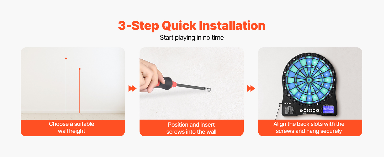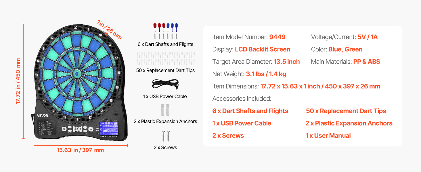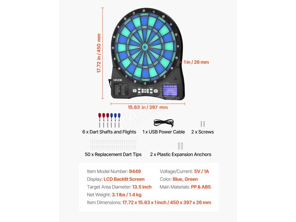Obsahuje 6 hriadeľov a letiek na šípky, 50 náhradných hrotov na šípky, 1 napájací kábel USB, 2 plastové rozširujúce kotvy, 2 skrutky a návod na použitie. Nie je potrebné žiadne profesionálne náradie - inštalácia trvá niekoľko minút a ihneď môžete začať hrať.