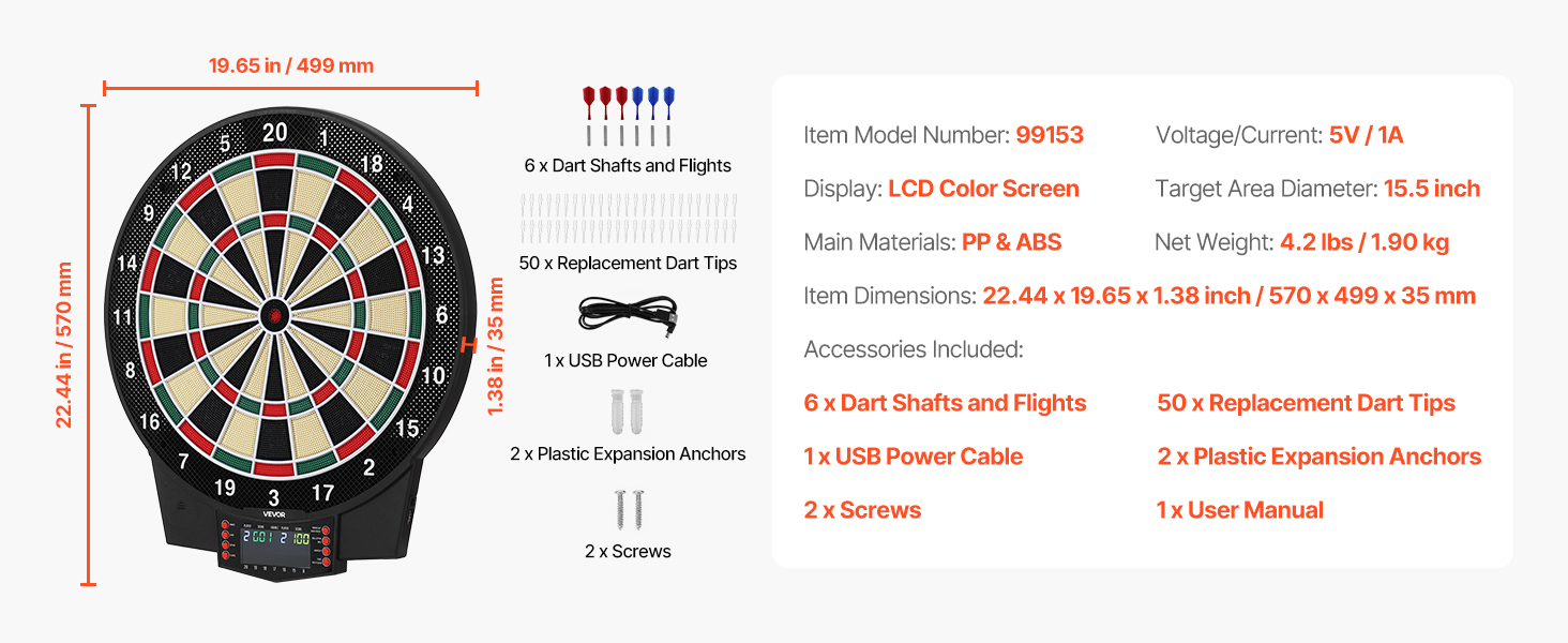 Obsahuje 6 hriadeľov a letiek na šípky, 50 náhradných hrotov na šípky, 1 napájací kábel USB, 2 plastové rozširujúce kotvy, 2 skrutky a návod na použitie. Nie je potrebné žiadne profesionálne náradie - inštalácia trvá niekoľko minút a ihneď môžete začať hrať.