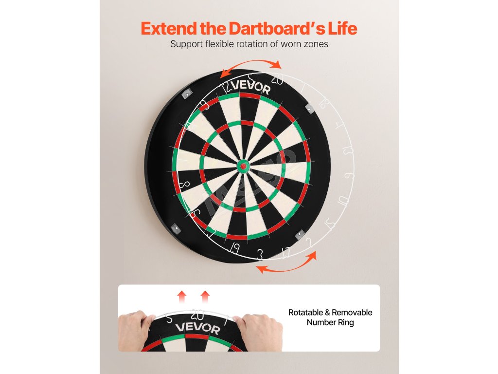 Tento terč na šípky, vyrobený zo samoregeneračných afrických sisalových vlákien s terčom bez sponiek a otočným číselným krúžkom na zvýšenie rýchlosti zásahov a zníženie počtu odskokov, prináša zábavu a relaxáciu pri rodinnej zábave alebo stretnutiach a je ideálnym doplnkom do vašej domácnosti, herne alebo klubovne.