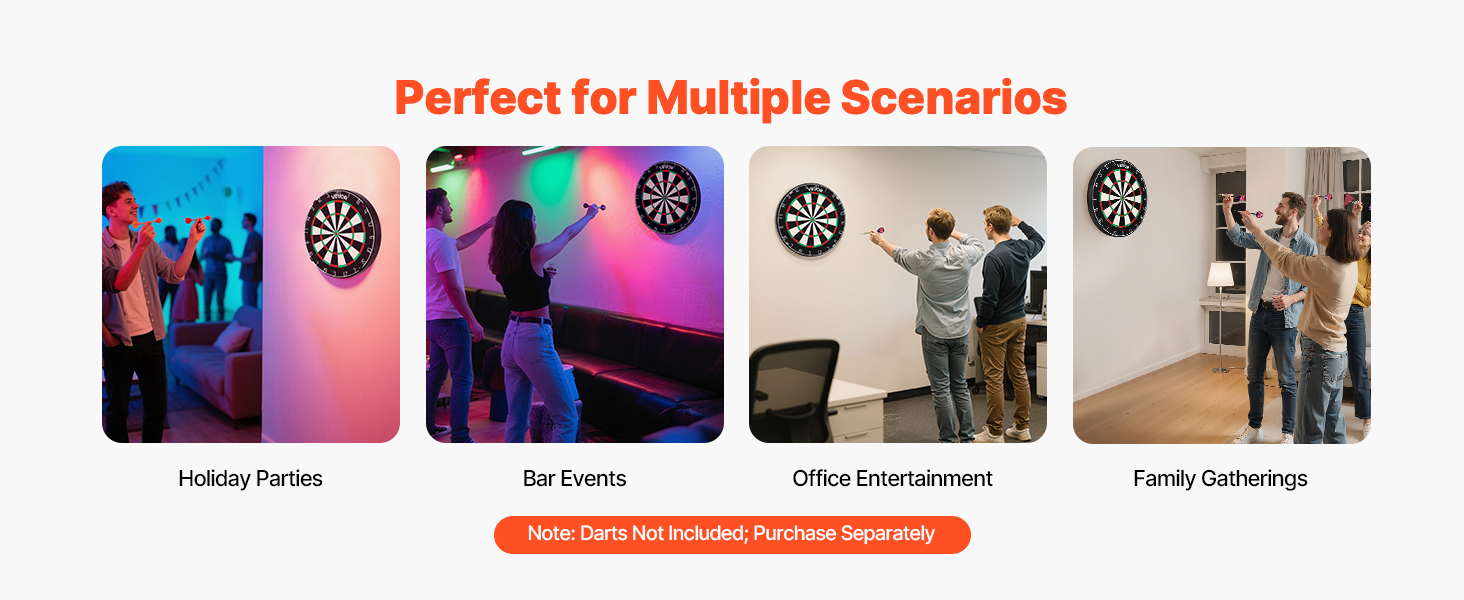 Či už ide o rodinnú oslavu, sviatočný večierok, klubové posedenie alebo barovú aktivitu, tento sisalový terč na šípky sa bez problémov hodí na každú príležitosť. Kombinuje interaktívnu zábavu so súťažnou hrou a je dokonalým nástrojom na spoločenské stretnutia a relaxáciu.