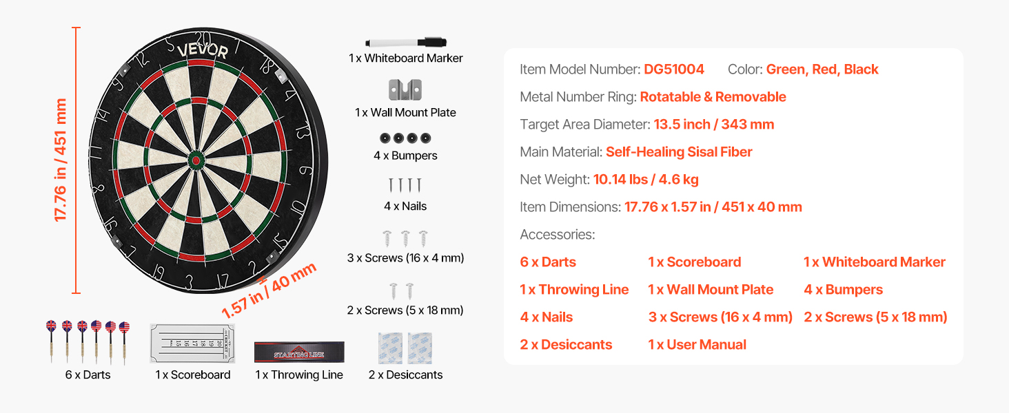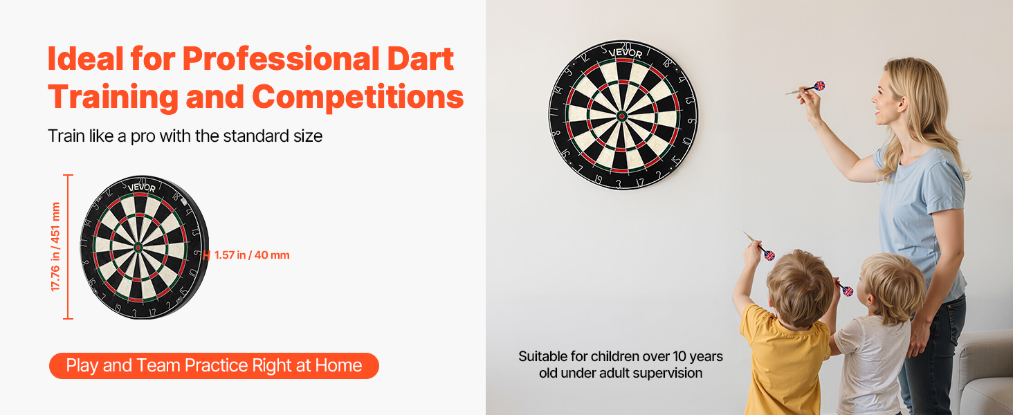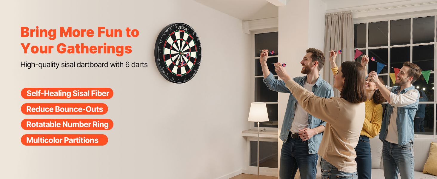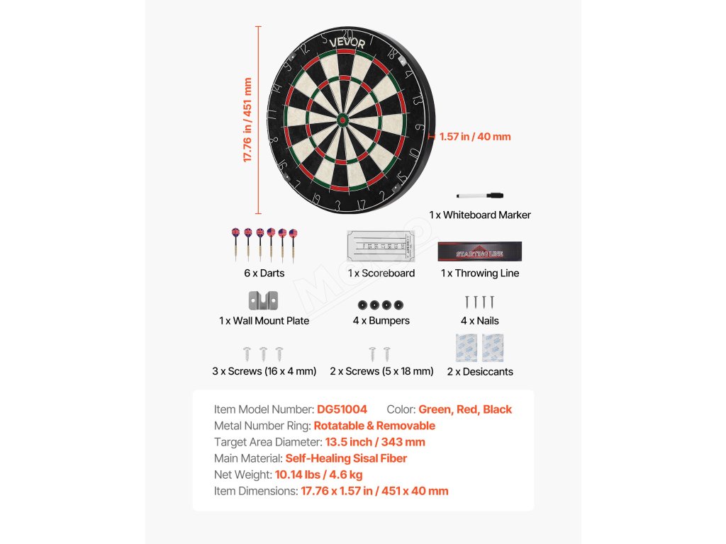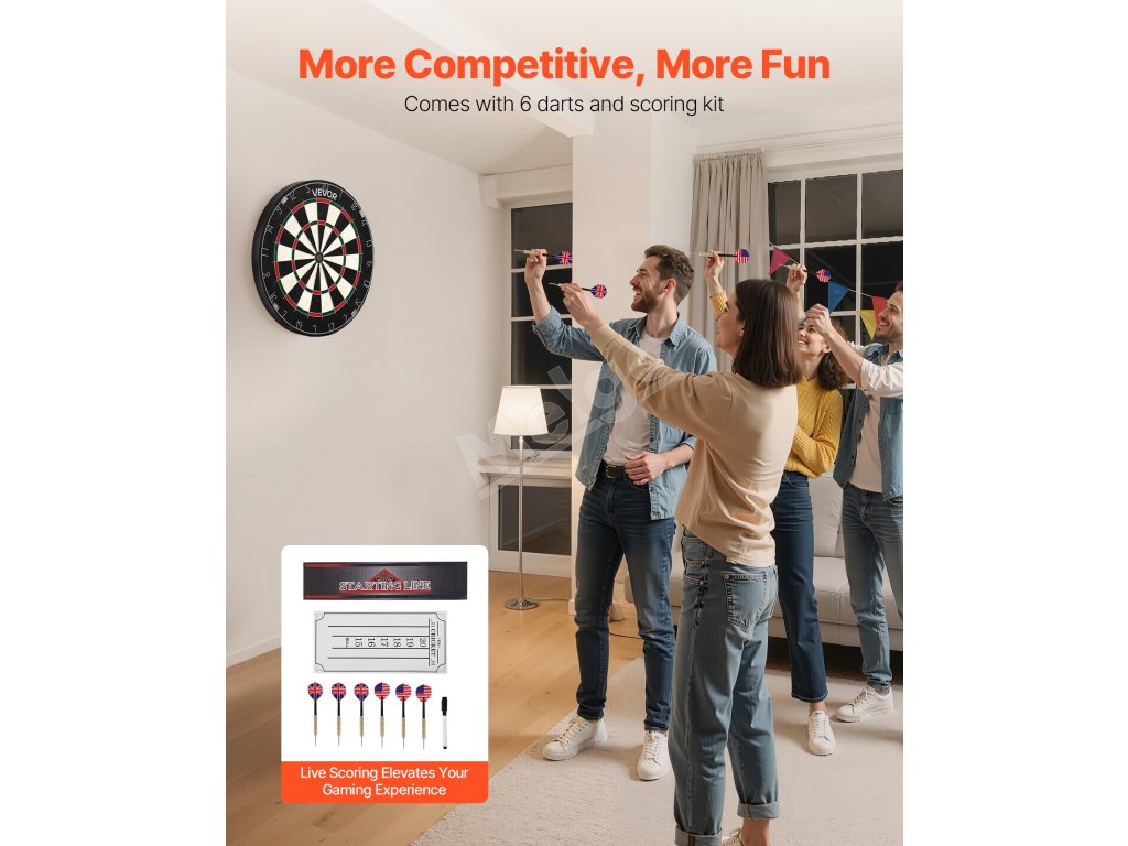 Terč na šípky VEVOR je vybavený prvotriednymi samoregeneračnými sisalovými vláknami, terčom bez sponiek a odnímateľným, otočným krúžkom s číslami. Dodáva sa so 6 šípkami s oceľovým hrotom a bodovacou súpravou. Zlepšuje presnosť zásahov, znižuje počet odrazov a prináša strhujúcu zábavu pre rodinu a priateľov.