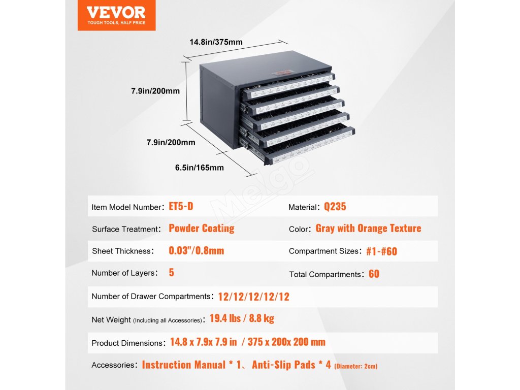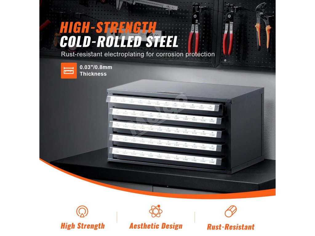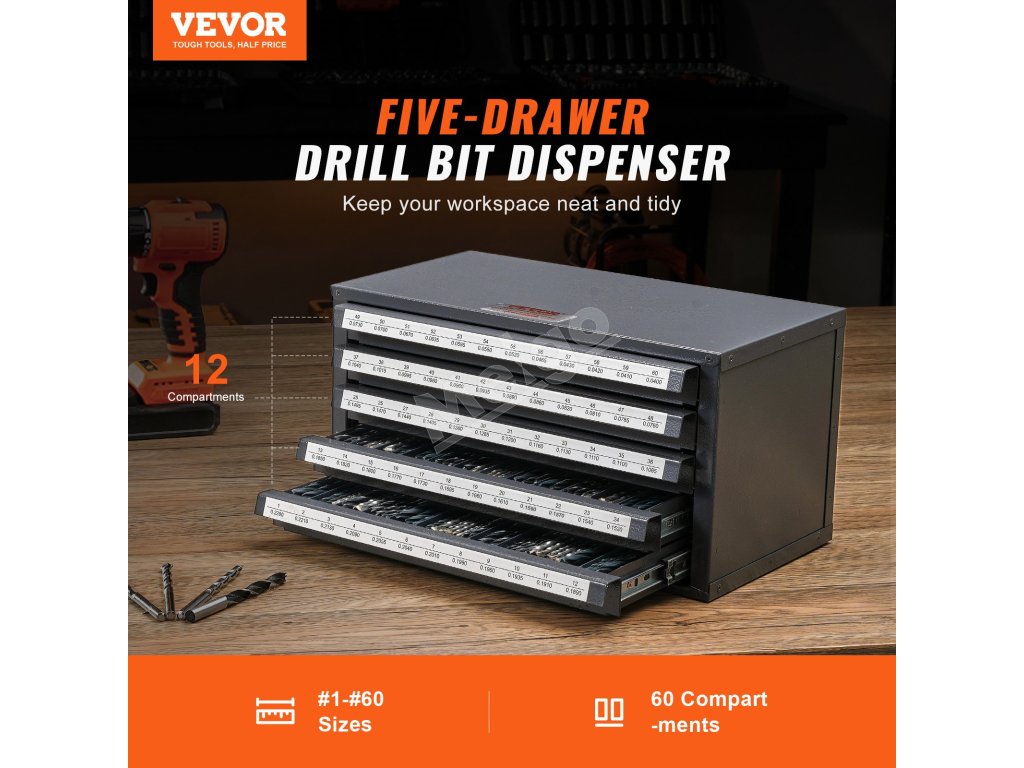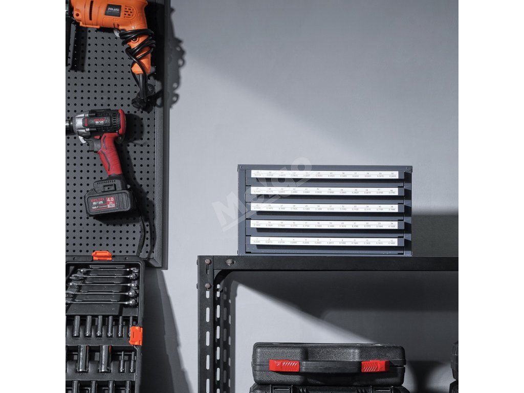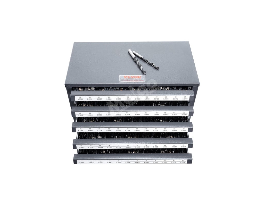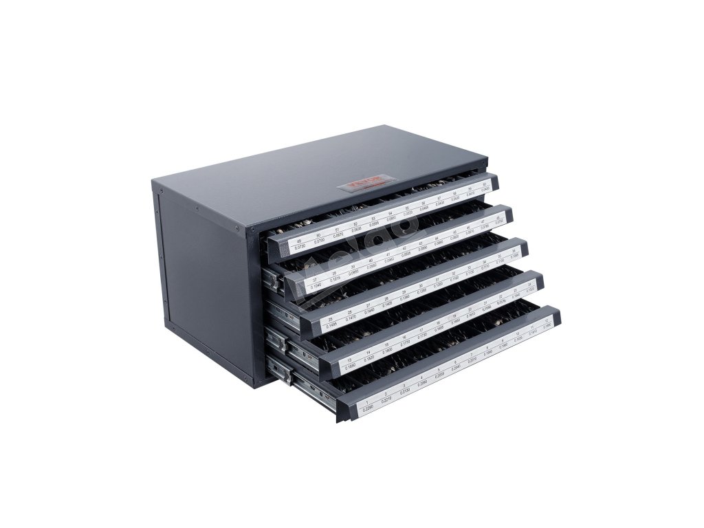 Táto skriňa so zásobníkom na vrtáky má päť priestranných zásuviek, do ktorých možno uložiť vrtáky od č. 1 do č. 60 s celkovým počtom 60 priehradiek. Každá priehradka pojme jeden vrták alebo iné príslušenstvo. Tieto priehradky poskytujú prehľadné pozície pre rôzne veľkosti a typy.
