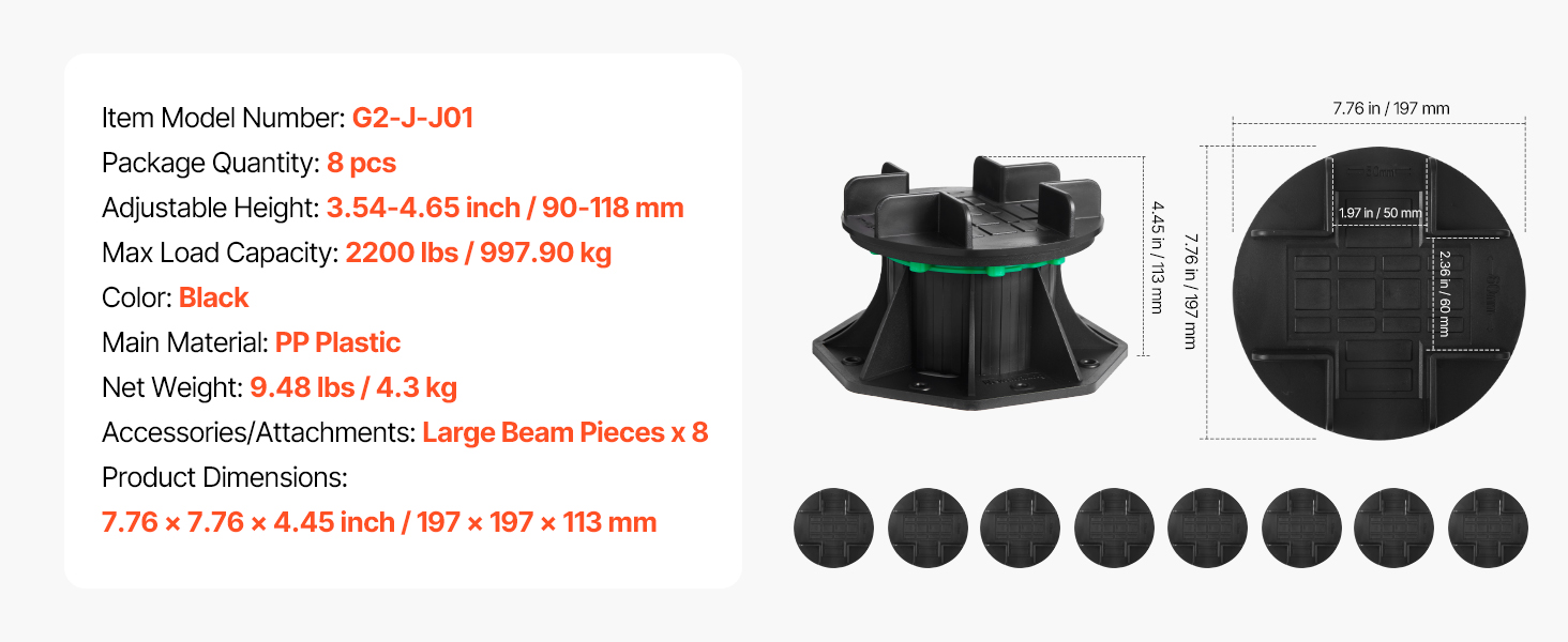 Podperné bloky terasy 8 pcs, 2200 lbs / 997.90 kg, 90–118 mm