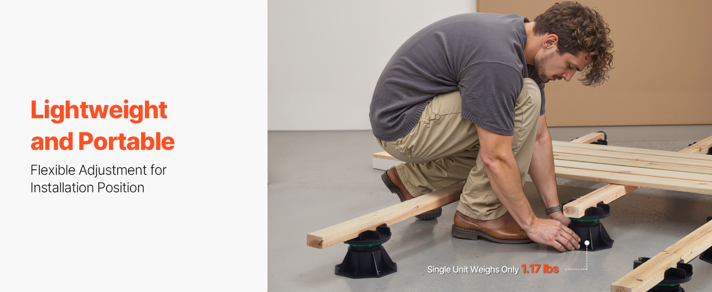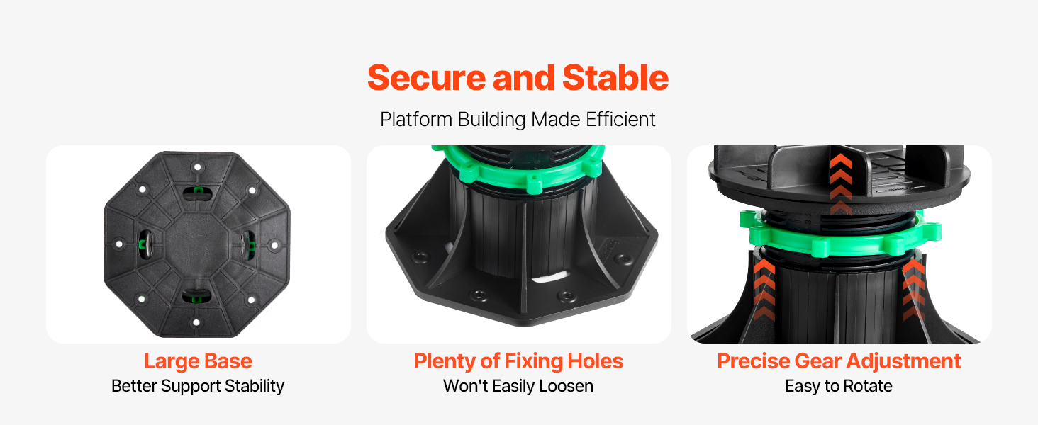 Trvanlivé a odolné voči vlhkosti a korózii sú naše podstavce na podopretie paluby vyrobené z vysokopevnostného PP materiálu. Sú nastaviteľné v rozsahu od 3,54 do 4,65 palca, ľahšie sa inštalujú a premiestňujú ako tradičné drevené stĺpiky, ideálne na terasy, vonkajšie terasy, hojdacie plošiny, fontány a iné.