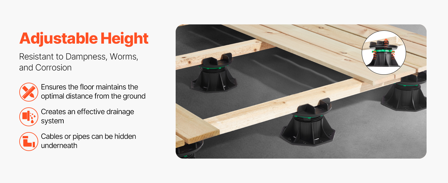 Náš nastaviteľný podstavec na podopretie paluby udržiava ideálnu vzdialenosť od zeme, čím izoluje vlhkosť a vytvára účinný drenážny systém. Zabraňuje poškodeniu dreva vlhkosťou a korózii a zároveň ukrýva káble alebo potrubia pre väčšiu bezpečnosť a odolnosť.