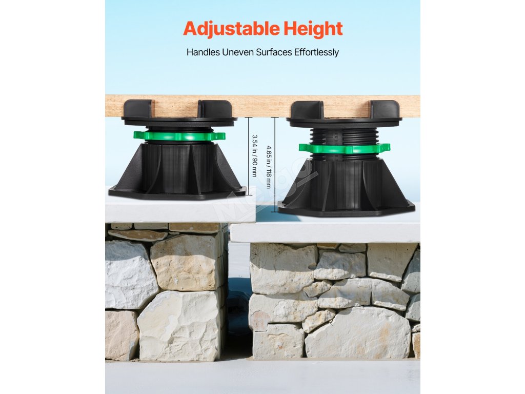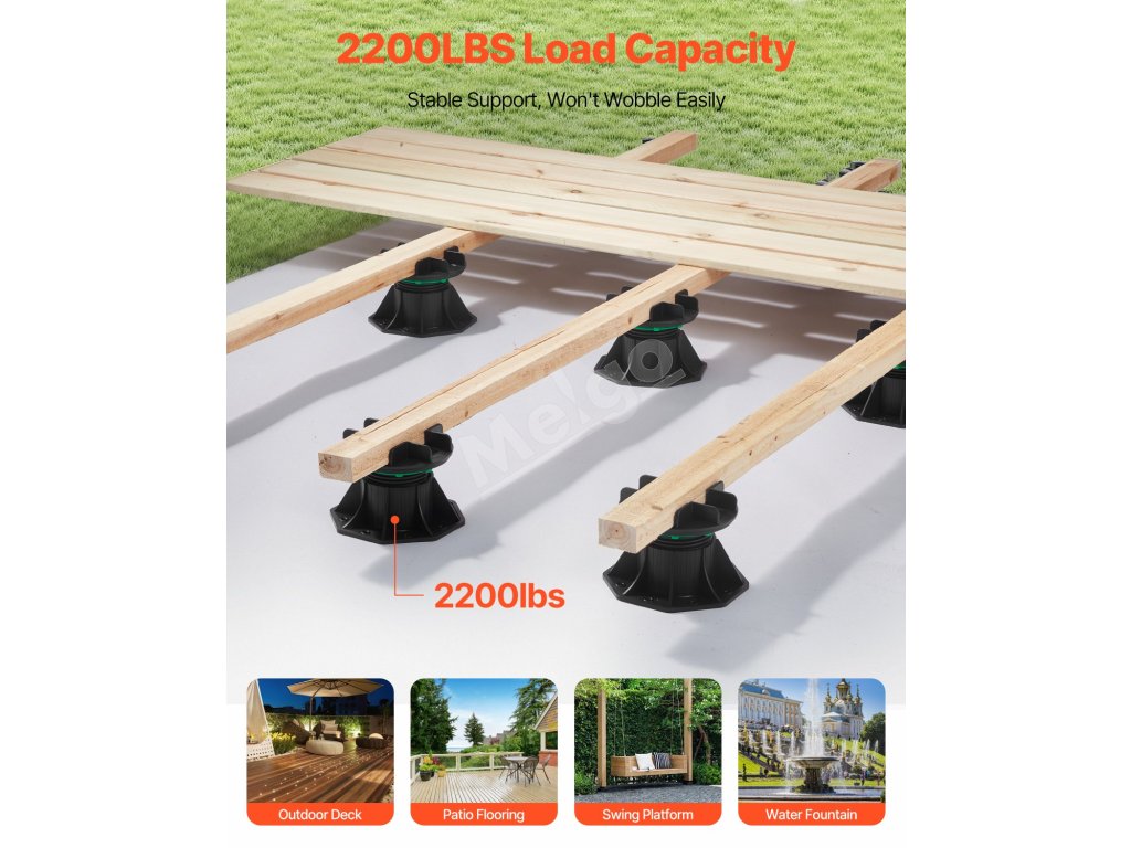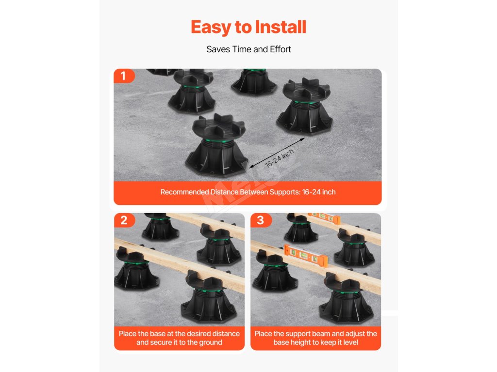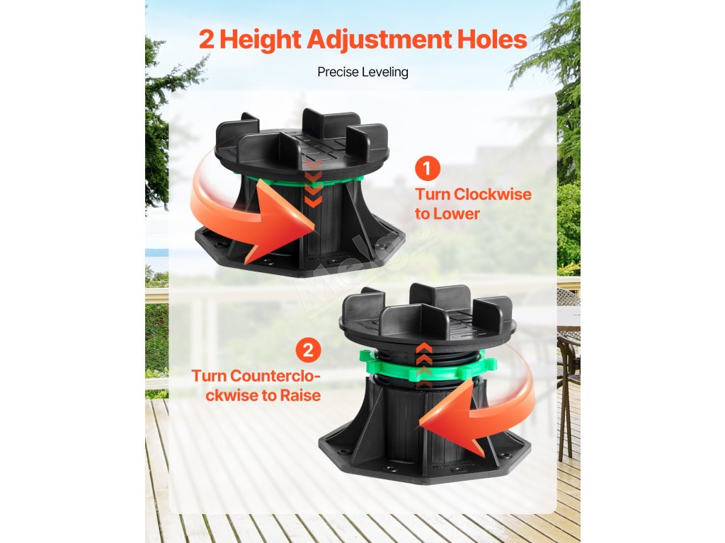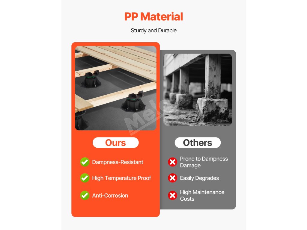 Trvanlivé a odolné voči vlhkosti a korózii sú naše podstavce na podopretie paluby vyrobené z vysokopevnostného PP materiálu. Sú nastaviteľné v rozsahu od 3,54 do 4,65 palca, ľahšie sa inštalujú a premiestňujú ako tradičné drevené stĺpiky, ideálne na terasy, vonkajšie terasy, hojdacie plošiny, fontány a iné.