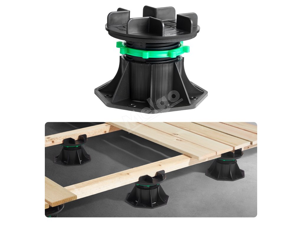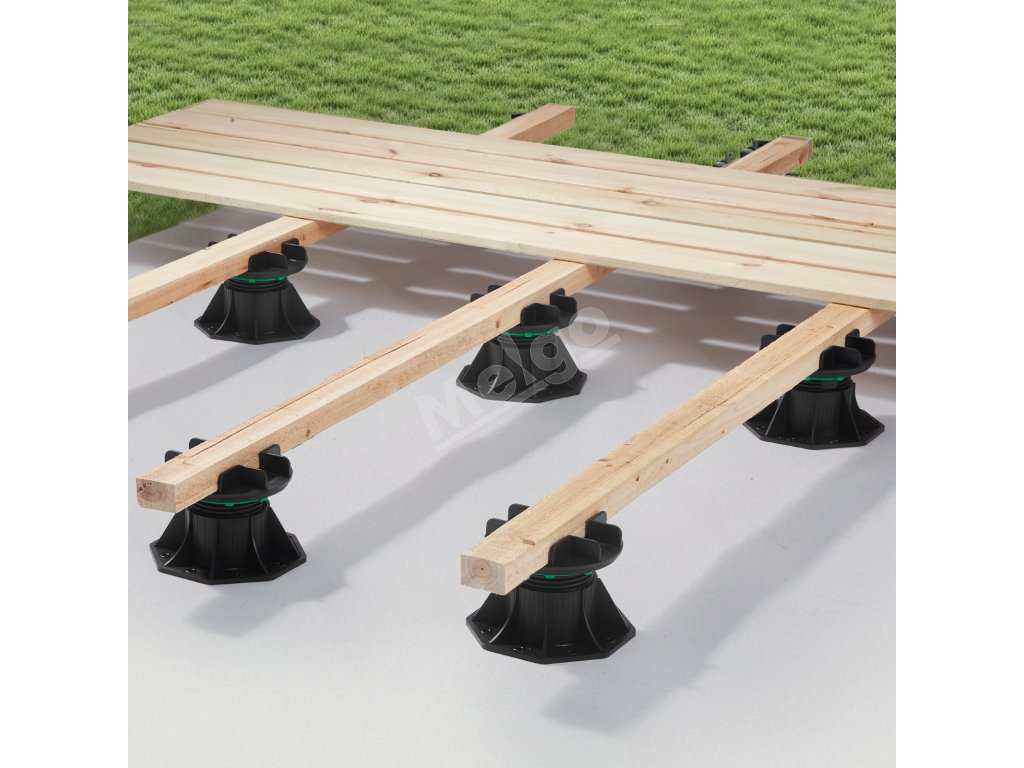 Náš nastaviteľný podstavec na podopretie paluby udržiava ideálnu vzdialenosť od zeme, čím izoluje vlhkosť a vytvára účinný drenážny systém. Zabraňuje poškodeniu dreva vlhkosťou a korózii a zároveň ukrýva káble alebo potrubia pre väčšiu bezpečnosť a odolnosť.