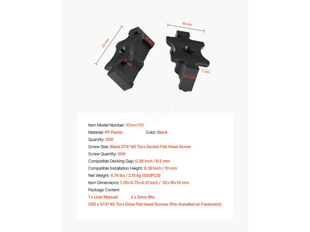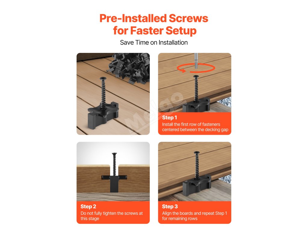 Tieto skryté upevňovacie prvky na palubu vybavené skrutkami s hviezdicovým pohonom ponúkajú lepší krútiaci moment, lepšiu priľnavosť a konštrukciu proti poškodeniu, čím sa znižuje riziko poškodenia hláv skrutiek alebo nástrojov.