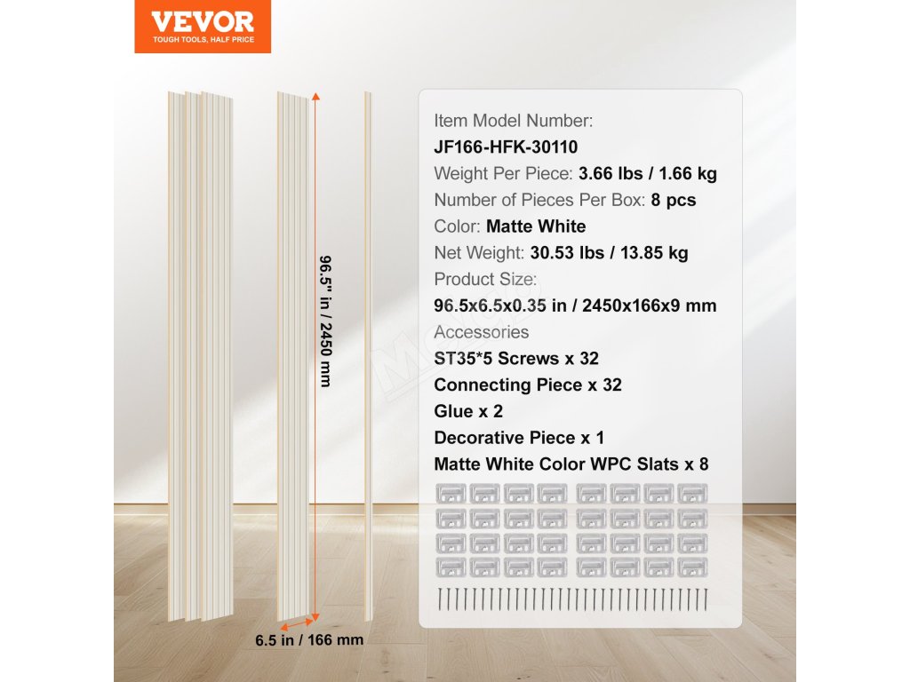 Akustické lamelové panely na stenu 8 ks 96×6" wpc biele matné