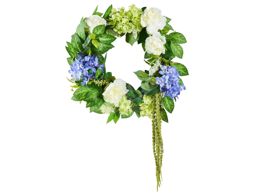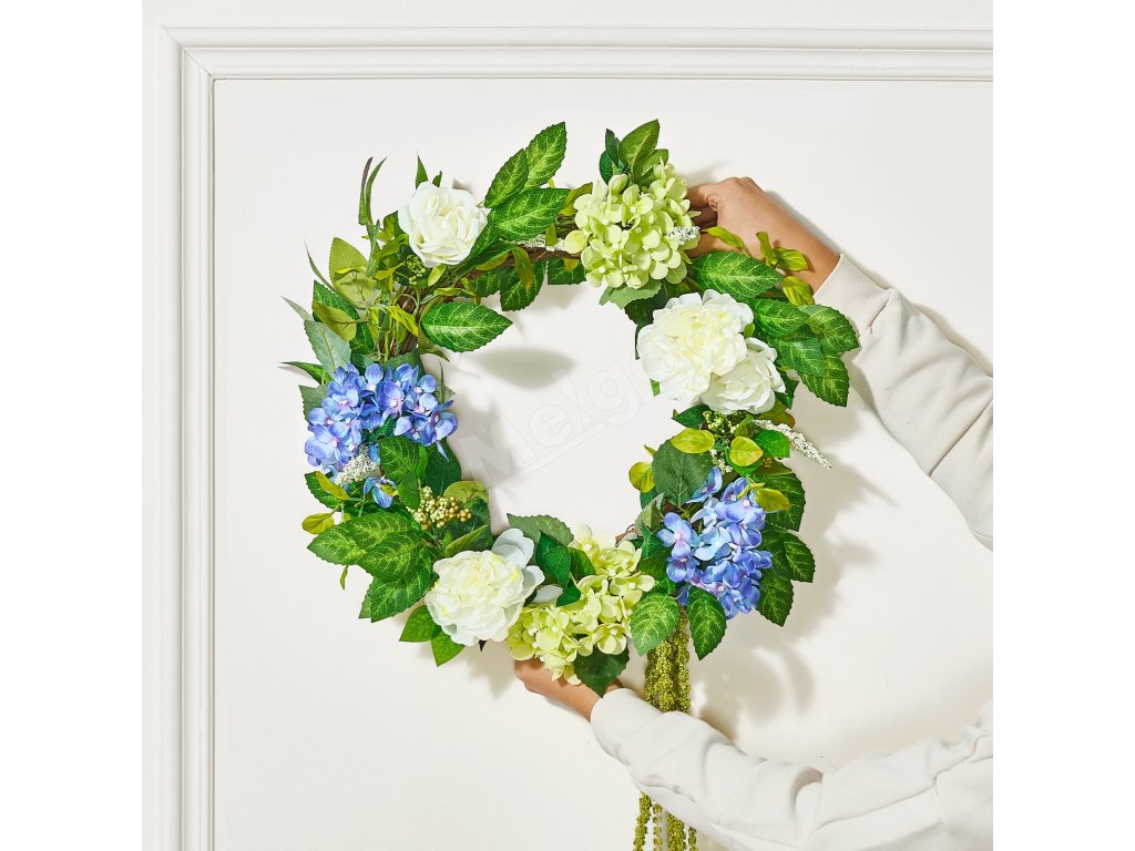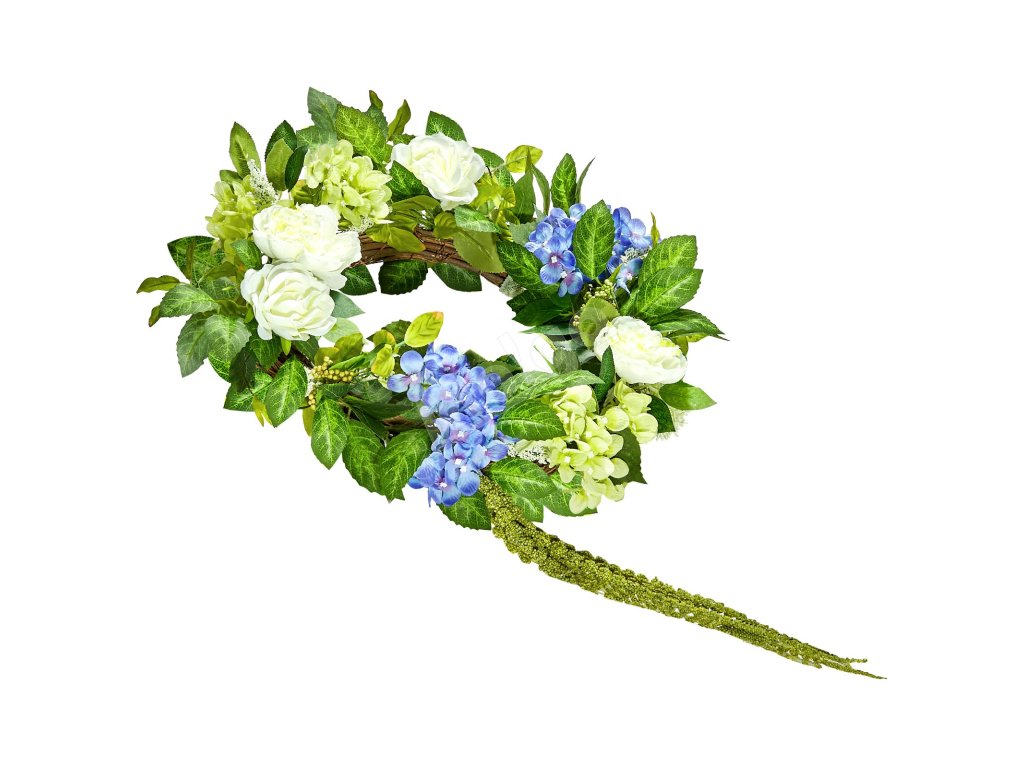 Ozdobný veniec 23 in modro-bielo-zelený, hortenzie, ruže a bobule