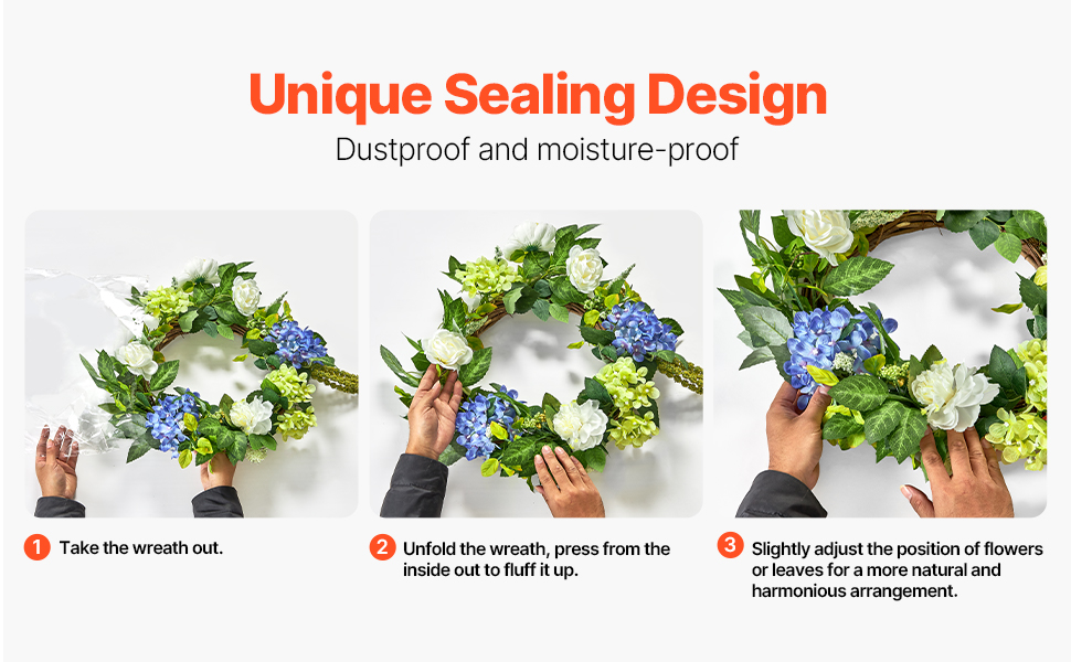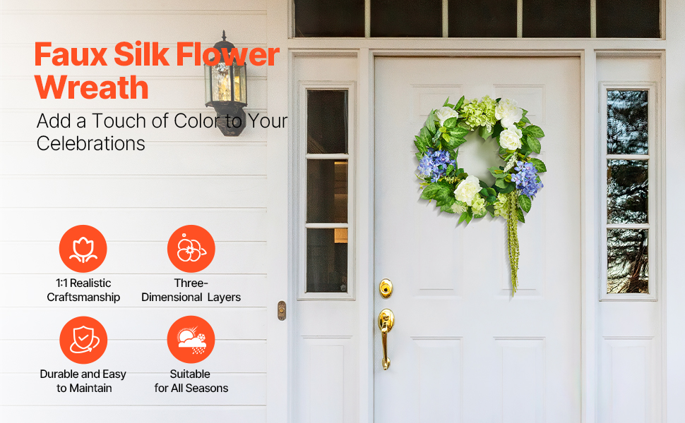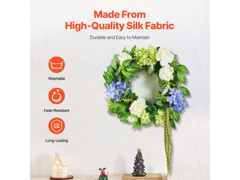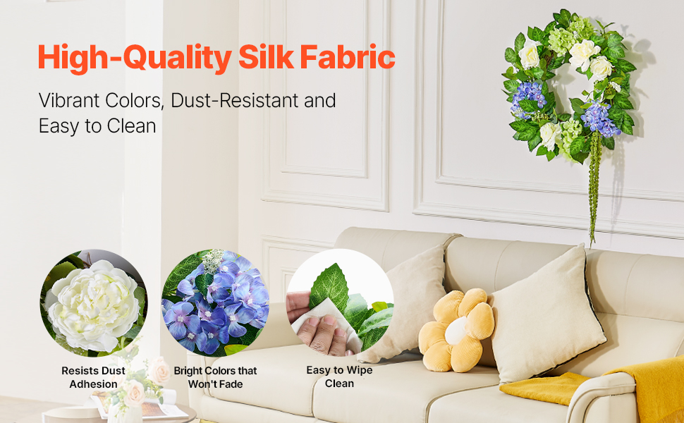 Povrch tohto venca na vchodové dvere, ktorý je vyrobený z vysokokvalitnej hodvábnej tkaniny, je hladký a odolný voči prachu, čím si zachováva žiarivé farby bez toho, aby časom vybledli. Možno ho jemne utrieť vlhkou handričkou alebo vyprať, takže je vhodný na dlhodobú dekoráciu v rôznych prostrediach.