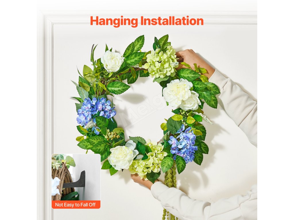Prosím, vyberte interiérový veniec a rozložte ho. Stlačte ho zvnútra smerom von. Narovnajte každý kvet a list, čím zaistíte rovnomerný, celistvý vzhľad. Nainštalujte háčiky alebo klince na požadované miesto a potom zaveste veniec, aby ste dokončili dekoráciu. Jednoduché kroky môžu skrášliť váš priestor.