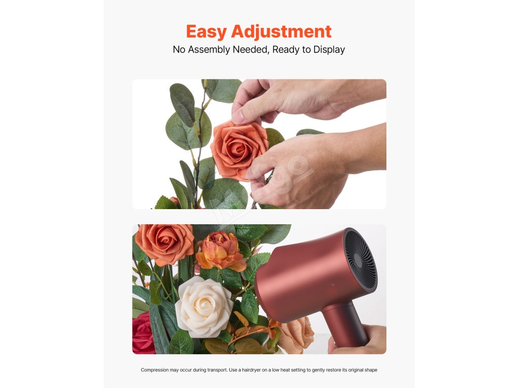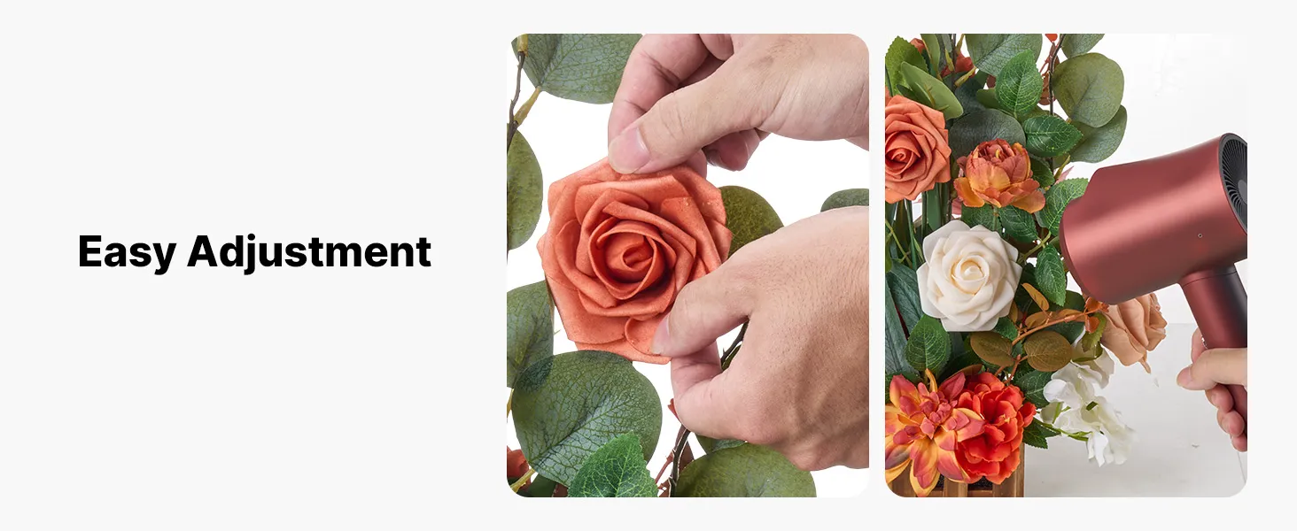 A2: Áno, každá kvetinová guľa je pre vaše pohodlie úplne zmontovaná. Vzhľadom na balenie môže dôjsť k miernemu stlačeniu. Jednoducho použite fén na niekoľko sekúnd na nízku teplotu a jemne rozložte okvetné lístky rukou, aby ste obnovili ich tvar.