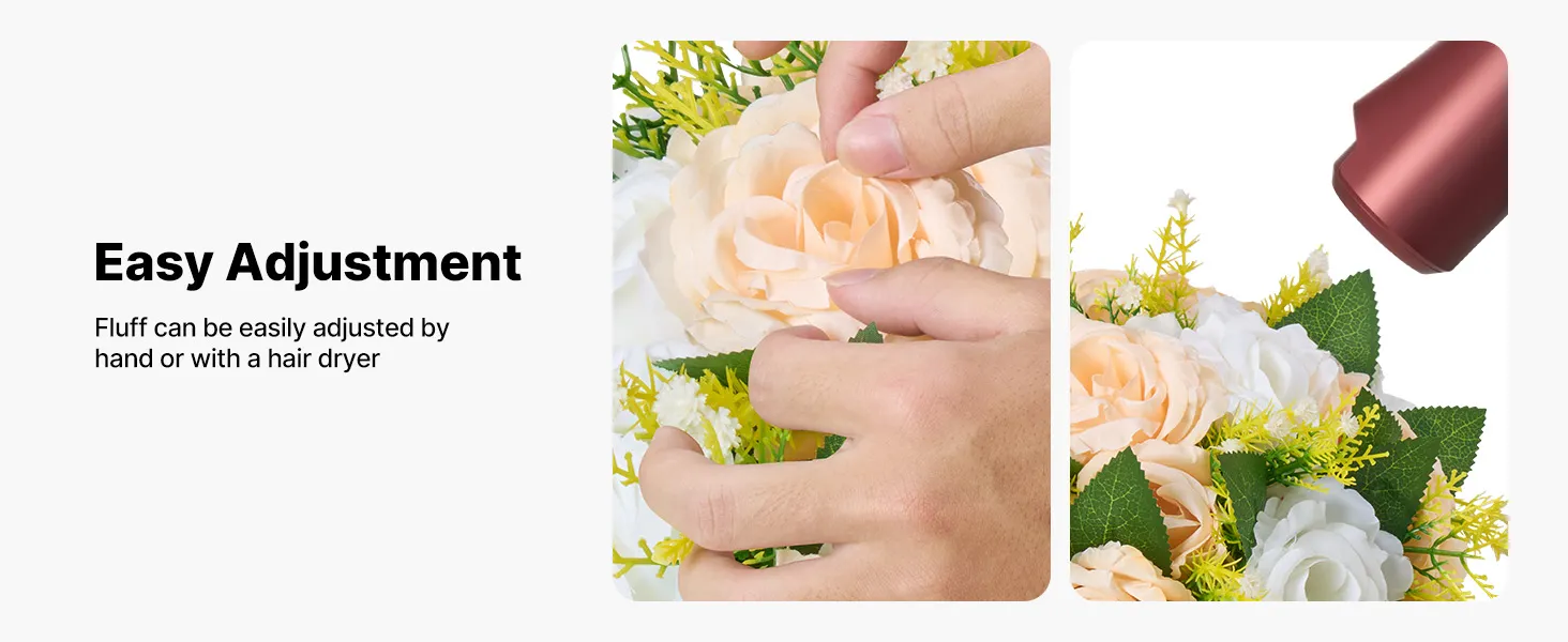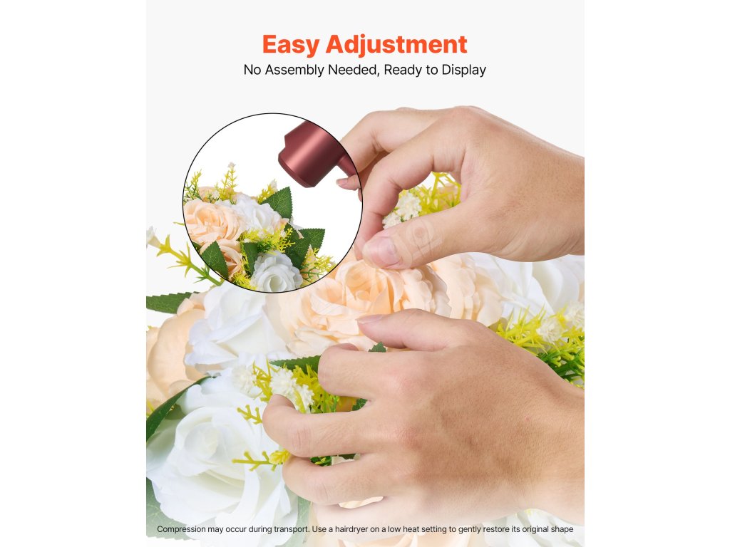 A2: Áno, každá kvetinová guľa je pre vaše pohodlie úplne zmontovaná. Vzhľadom na balenie môže dôjsť k miernemu stlačeniu. Jednoducho použite fén na niekoľko sekúnd na nízku teplotu a jemne rozložte okvetné lístky rukou, aby ste obnovili ich tvar.