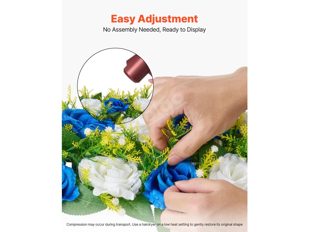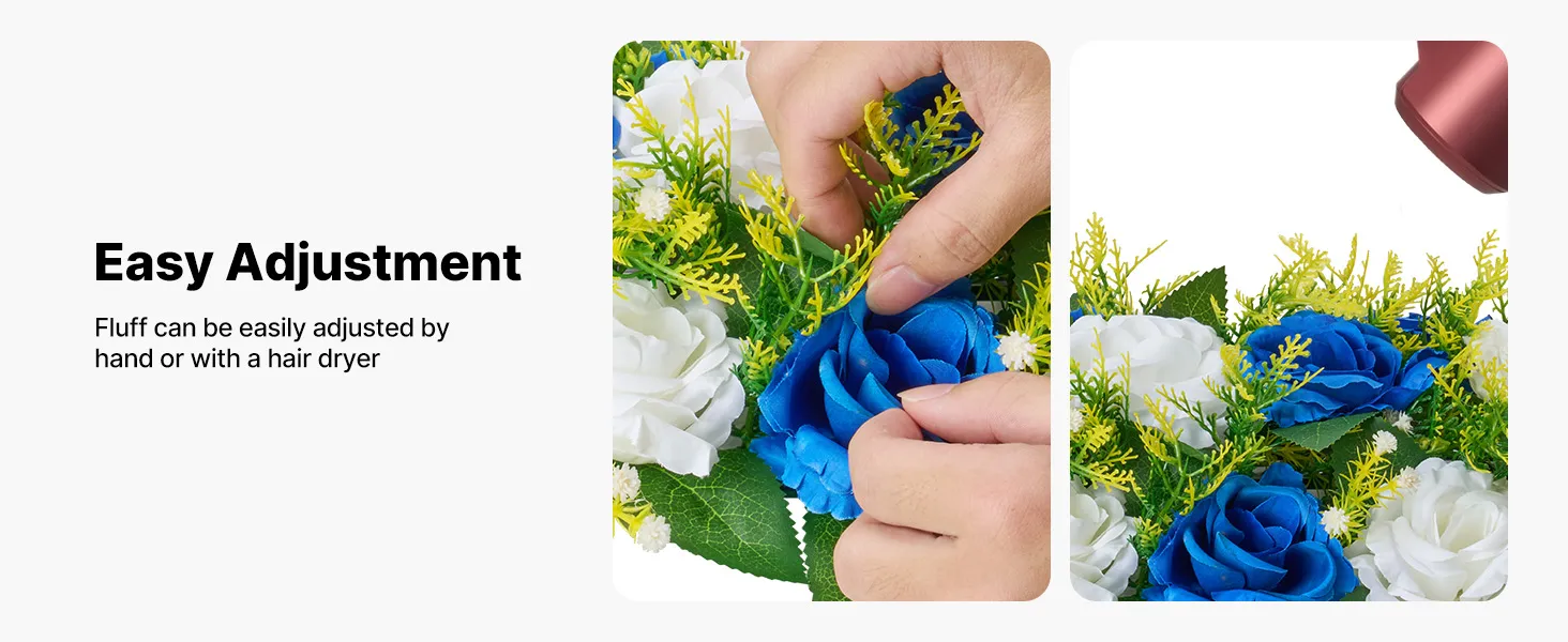 A2: Áno, každá kvetinová guľa je pre vaše pohodlie úplne zmontovaná. Vzhľadom na balenie môže dôjsť k miernemu stlačeniu. Jednoducho použite fén na niekoľko sekúnd na nízku teplotu a jemne rozložte okvetné lístky rukou, aby ste obnovili ich tvar.