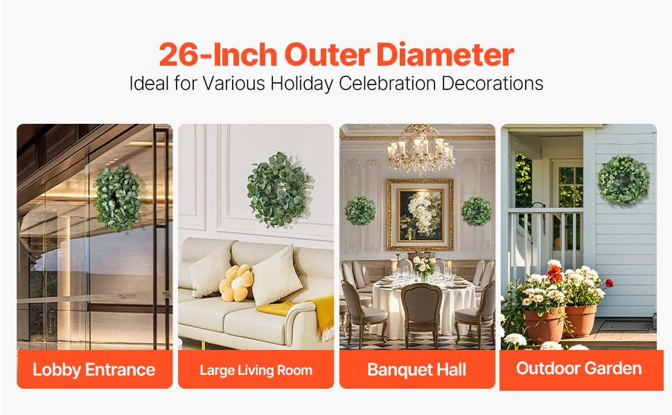 Tento umelý veniec s vonkajším priemerom približne 26 palcov je ideálny na zdobenie vstupných hál, veľkých obývacích izieb, banketových sál a vonkajších záhrad a iných domácich priestorov, ktorým dodá nádych prirodzenej elegancie.