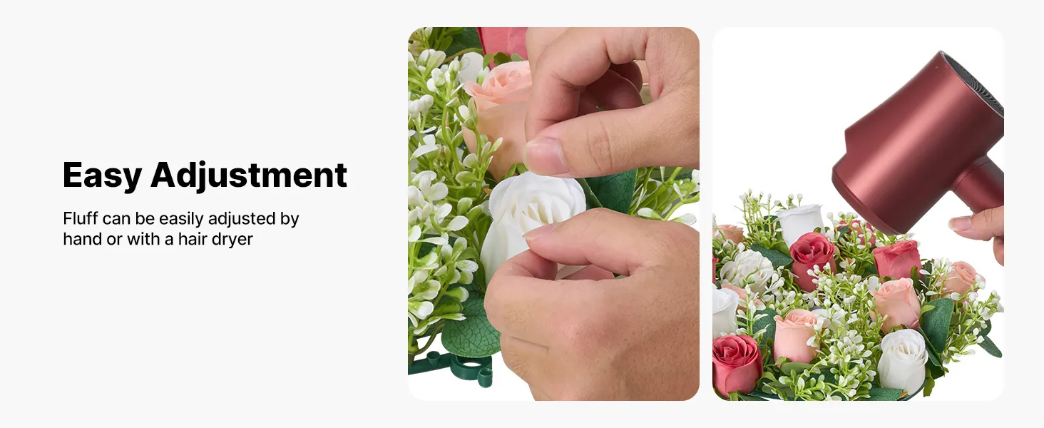 A2: Áno, každá kvetinová guľa je pre vaše pohodlie úplne zmontovaná. Vzhľadom na balenie môže dôjsť k miernemu stlačeniu. Jednoducho použite fén na niekoľko sekúnd na nízku teplotu a jemne rozložte okvetné lístky rukou, aby ste obnovili ich tvar.