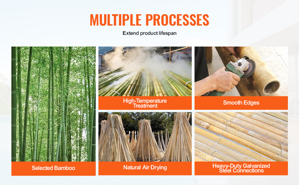 Každá bambusová tyč prechádza tradičným ošetrením vrátane naparovania pri vysokej teplote, prania a prirodzeného sušenia. Vďaka spojeniu s hrubými pozinkovanými oceľovými drôtmi je bambusový plot odolný proti korózii a zabezpečuje pevnú konštrukciu, čím sa predlžuje jeho životnosť.