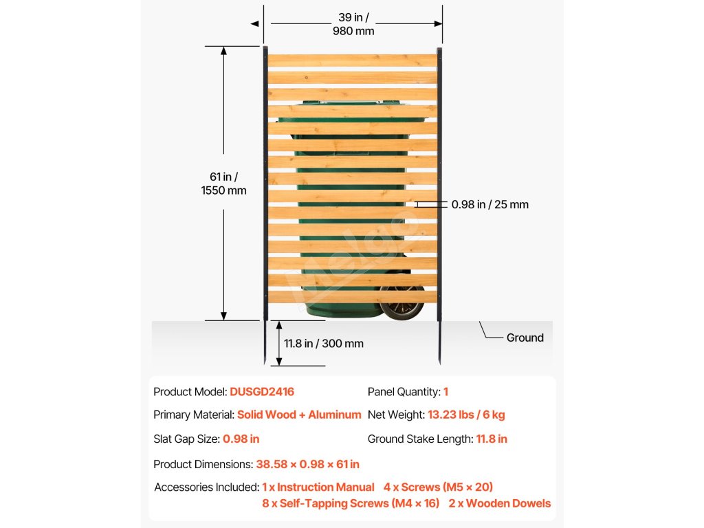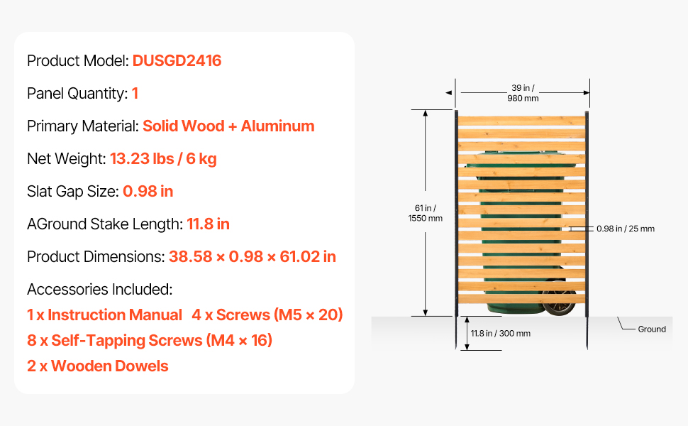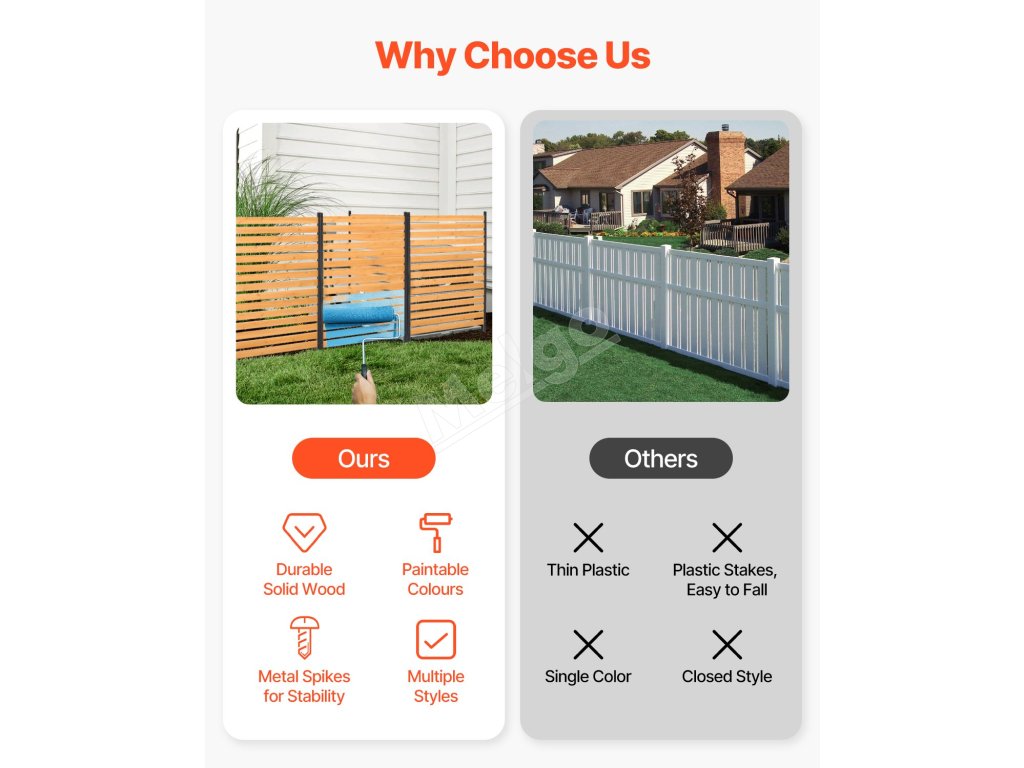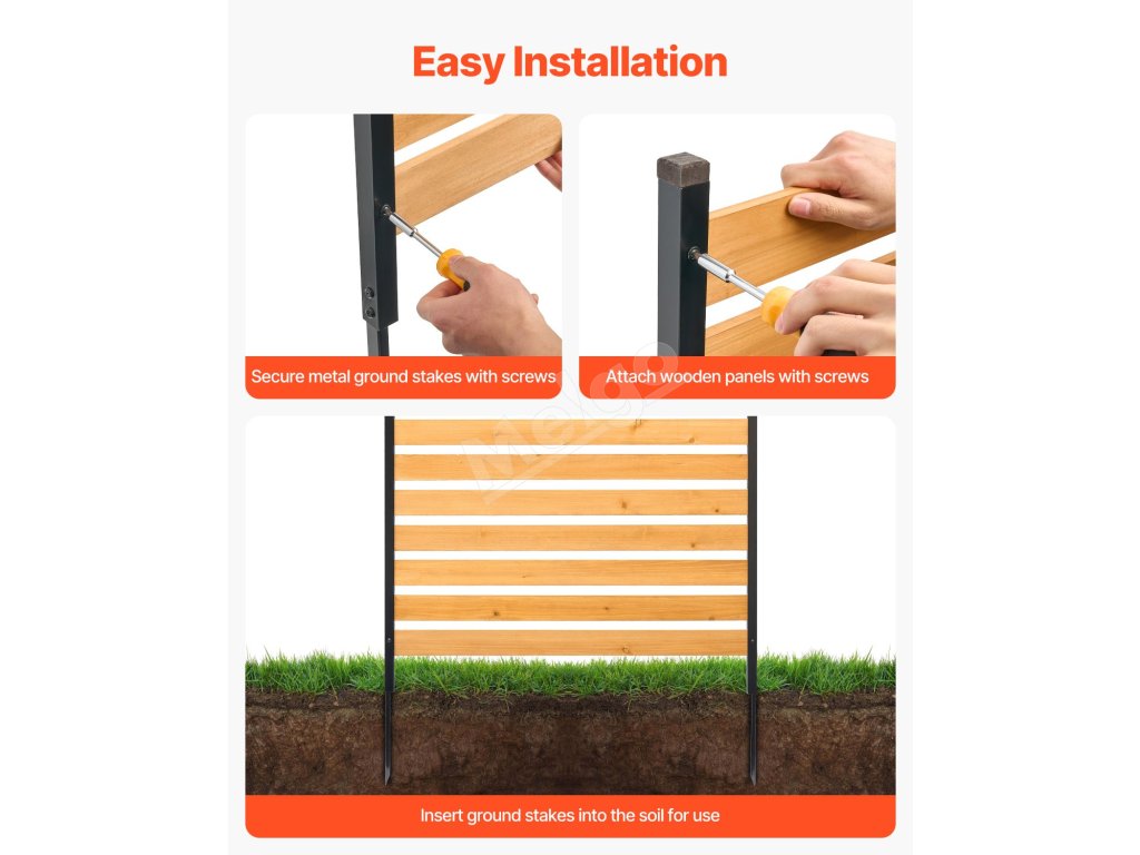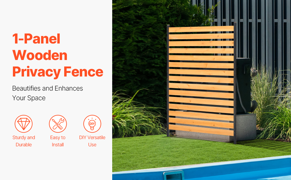 Tento drevený plot, vyrobený z odolného masívneho dreva a pevných kovových kolíkov, zaručuje stabilitu a odolnosť proti deformácii. Jednoduchá inštalácia bez použitia náradia, ktorú zvládne jedna osoba. Ideálny na zakrytie klimatizačných jednotiek, smetných košov a bazénového vybavenia alebo ako dekoratívny záhradný plot, ktorý skrášli váš vonkajší priestor.
