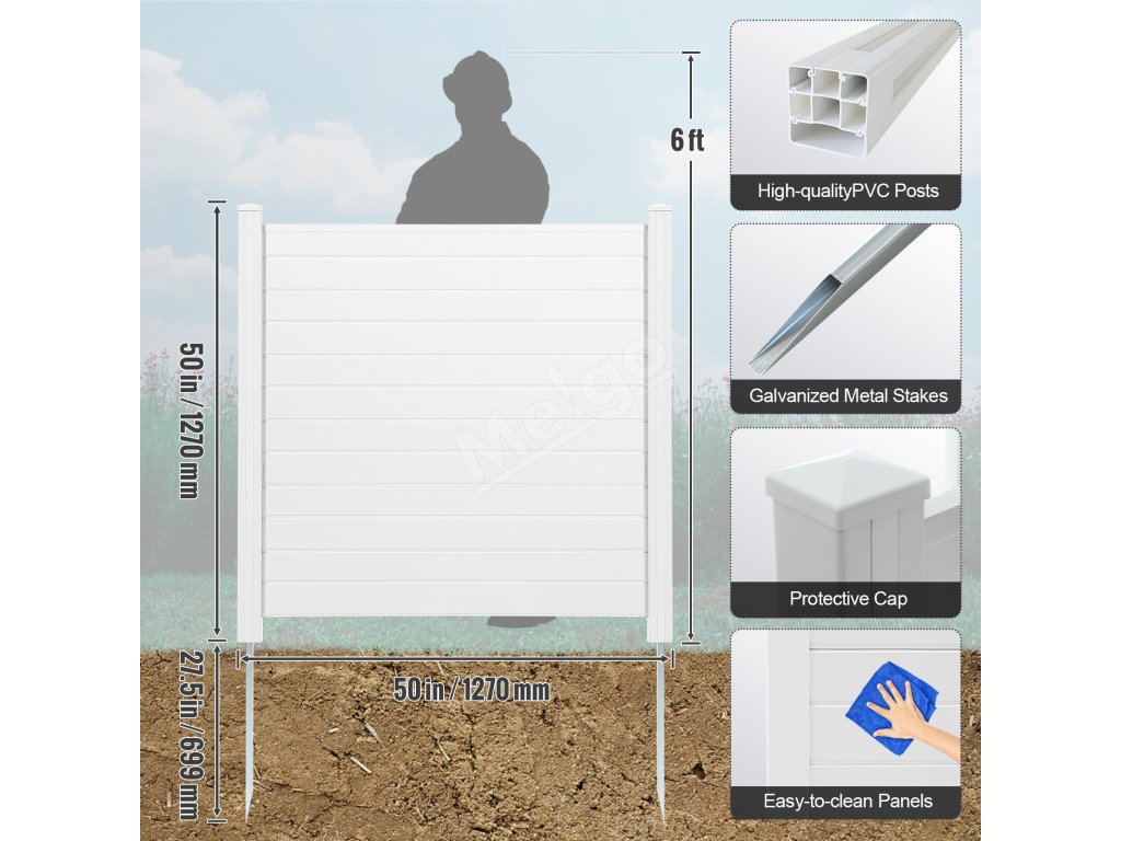 Náš 4-panelový plot z PVC na ochranu súkromia s odolnými pozinkovanými kovovými kolíkmi zaručuje dlhodobé používanie v exteriéri. Veľkosť 50 "x50" ponúka všestranné možnosti ohradenia pre vonkajšie vybavenie alebo súkromné priestory. Dodáva sa so všetkým potrebným príslušenstvom a podrobnými pokynmi, ktoré sú ideálne na pozdvihnutie vzhľadu vášho dvora.