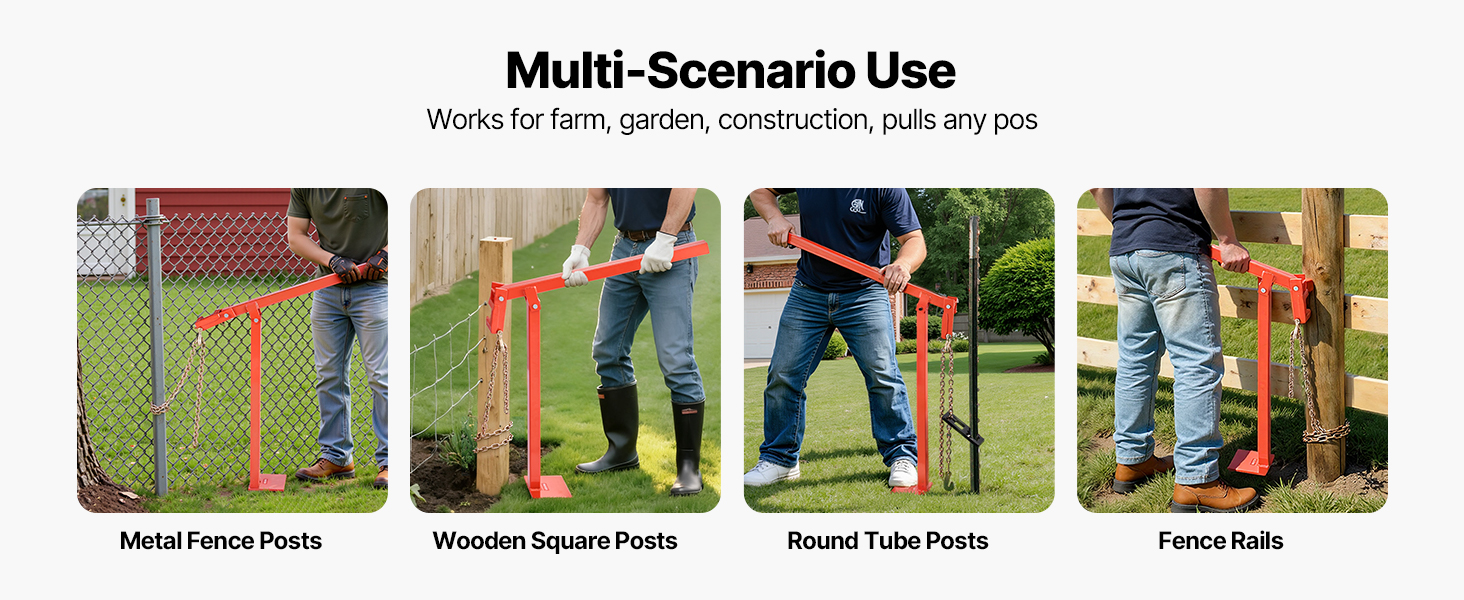 Tento rýchlovýťahový vyťahovač stĺpikov je ideálny pre farmy, záhrady a staveniská, ľahko vyťahuje kovové plotové stĺpiky, drevené stĺpiky a štvorcové stĺpiky. Jeden nástroj zvládne viacero úloh bez použitia elektrickej energie, čo umožňuje efektívnu a pohodlnú prevádzku.