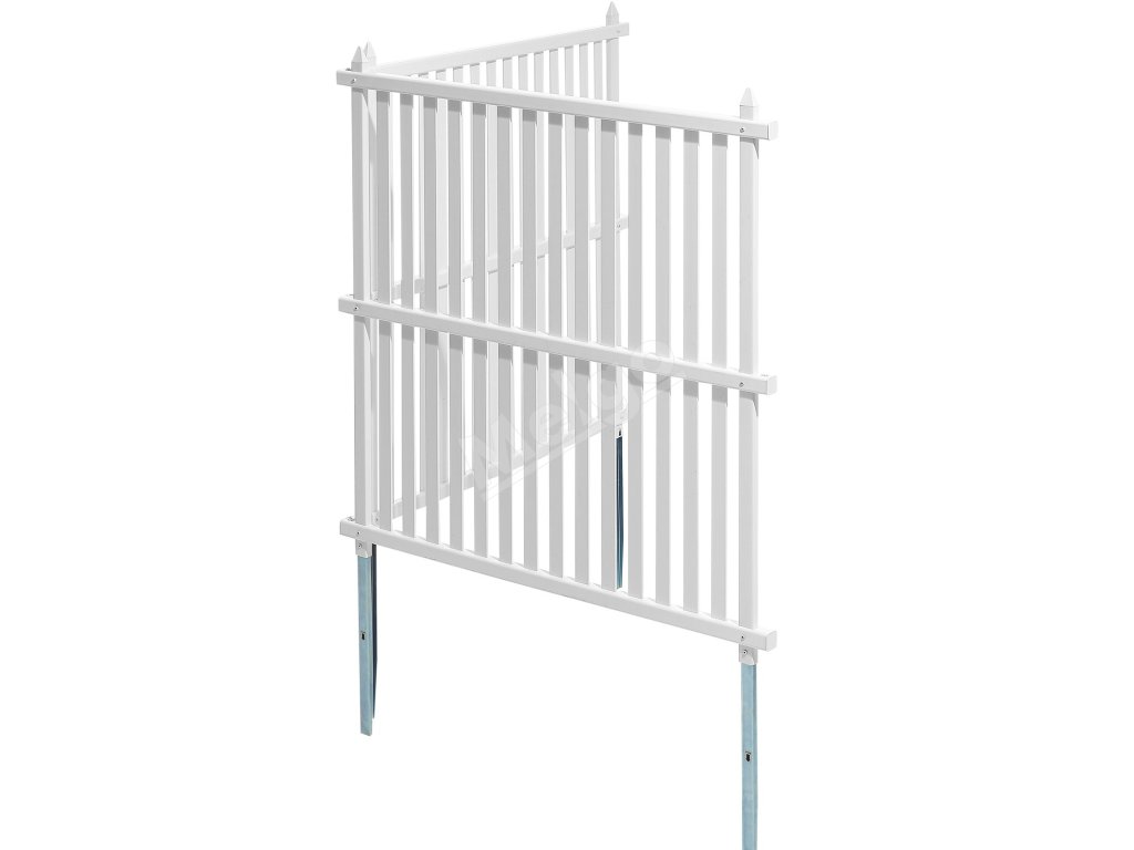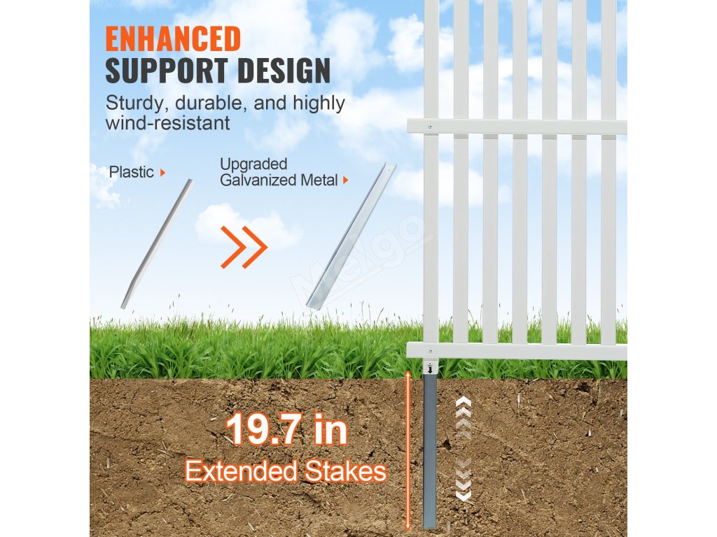 Štandardné plastové kolíky sme nahradili pozinkovanými kovovými. Rozšírené na 19,7 palca na hlboké ukotvenie v pôde posilňujú stabilitu vinylového plotového panelu. Zabudovanie kovových nôh do stĺpikov znižuje priame poškodenie pri silnom daždi alebo búrke.
