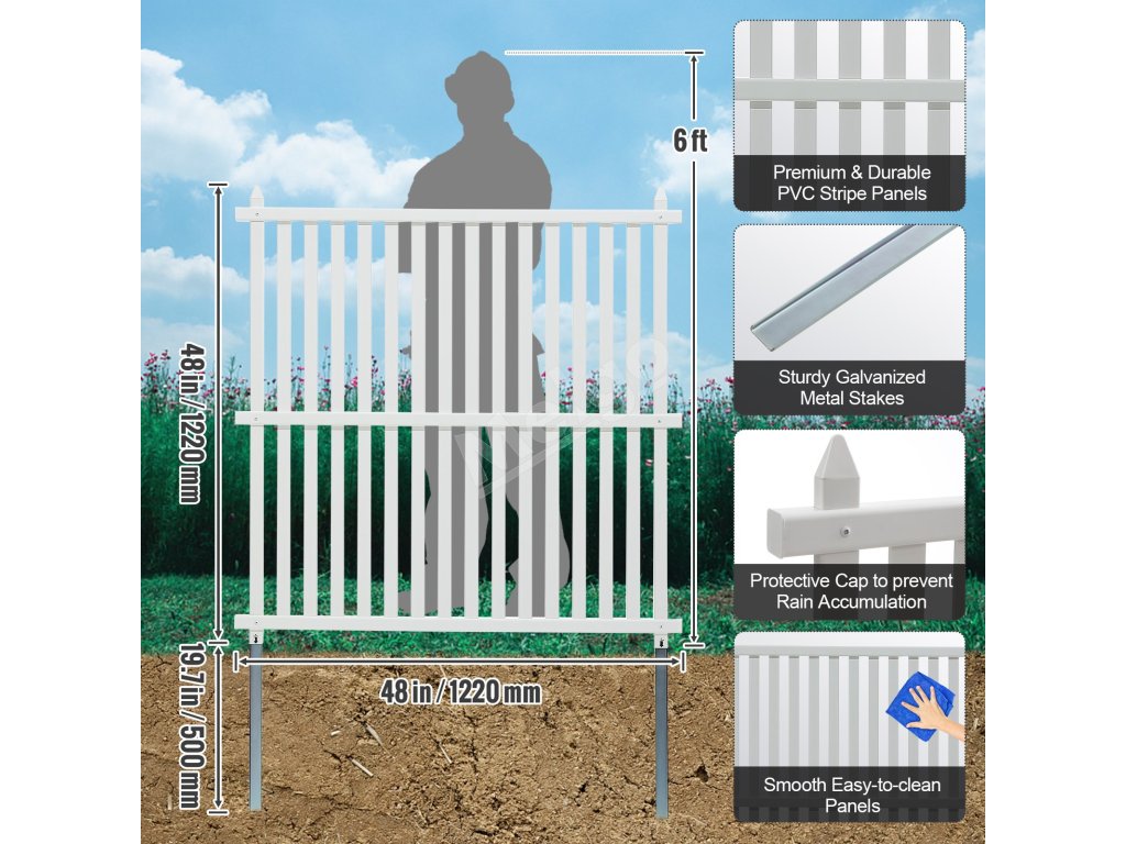Náš pásový plot z PVC na ochranu súkromia s odolnými pozinkovanými kovovými kolíkmi zaručuje dlhodobé používanie v exteriéri. Veľkosť 48" x 48" ponúka všestranné možnosti ohradenia pre vonkajšie vybavenie alebo súkromné priestory. Dodáva sa so všetkým potrebným príslušenstvom a podrobnými pokynmi, ktoré sú ideálne na pozdvihnutie vzhľadu vášho dvora.