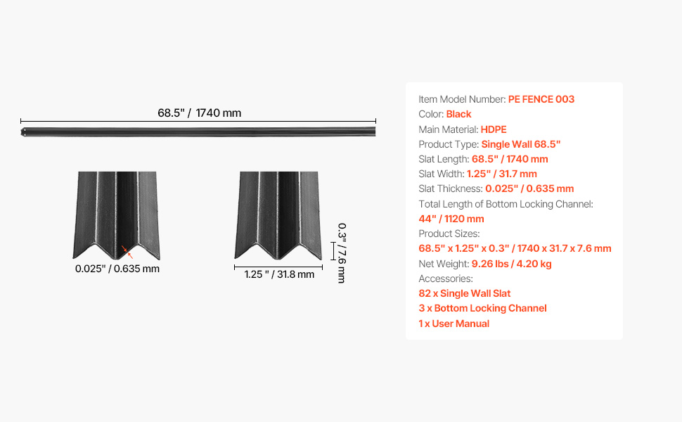 Tieto 68,5" lamely sú určené pre 6' vysoké ploty. Tieto lamely sú vyrobené z HDPE s vysokou hustotou, sú odolné voči poveternostným vplyvom, trvanlivé a ľahko sa inštalujú. Každé balenie obsahuje 82 lamiel a 3 spodné uzamykacie kanály pre 10 ft ploty, ktoré zabezpečujú bezpečné a stabilné uchytenie.