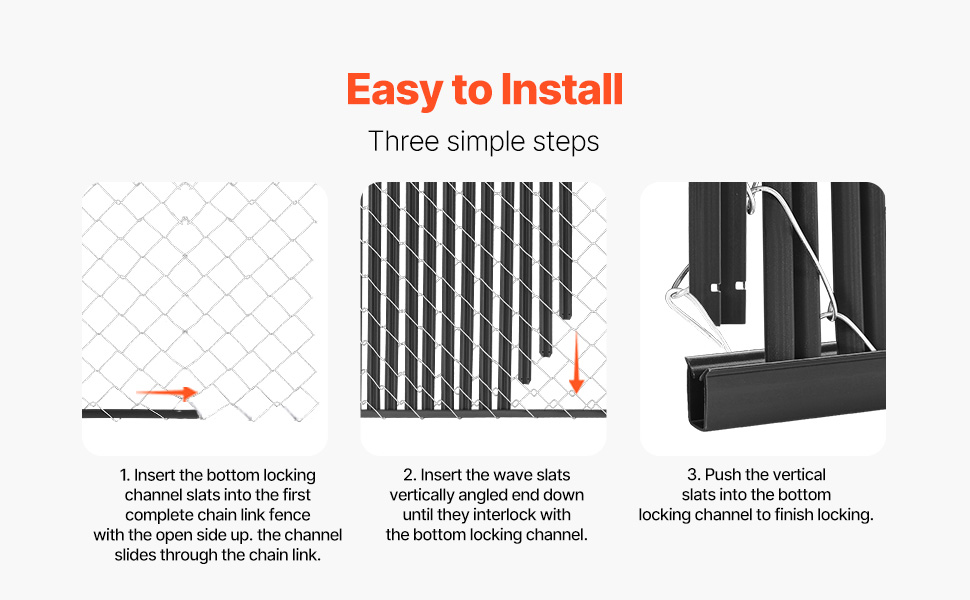 Spodné uzamykateľné lamely na ochranu súkromia vyžadujú len tri jednoduché kroky. Najprv vložte spodné lamely s uzamykacím kanálom do základne plota. Potom posuňte lamely na ochranu súkromia vertikálne nadol a zaistite ich v spodnom kanáli. Inštaláciu plota tak môžete jednoducho dokončiť.