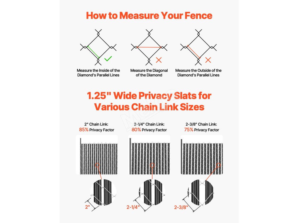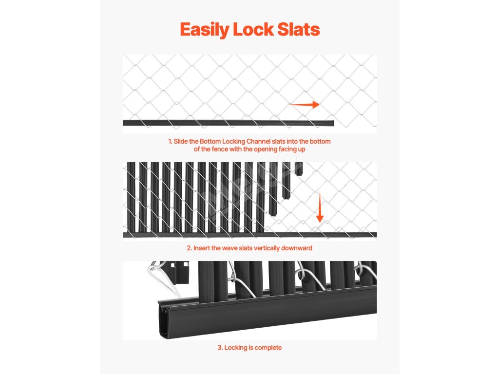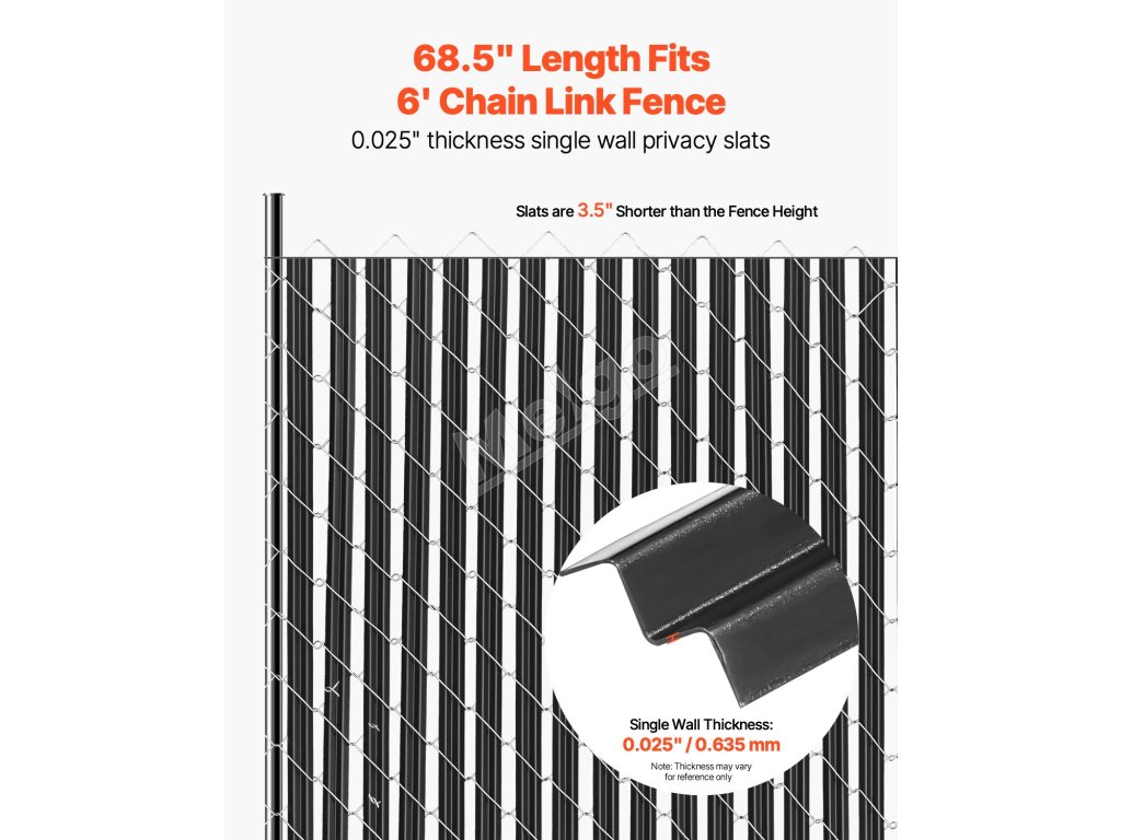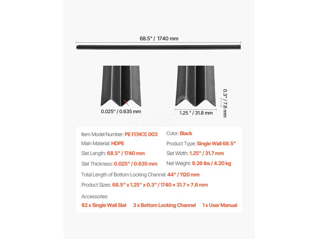 Tieto 68,5" lamely sú určené pre 6' vysoké ploty. Tieto lamely sú vyrobené z HDPE s vysokou hustotou, sú odolné voči poveternostným vplyvom, trvanlivé a ľahko sa inštalujú. Každé balenie obsahuje 82 lamiel a 3 spodné uzamykacie kanály pre 10 ft ploty, ktoré zabezpečujú bezpečné a stabilné uchytenie.
