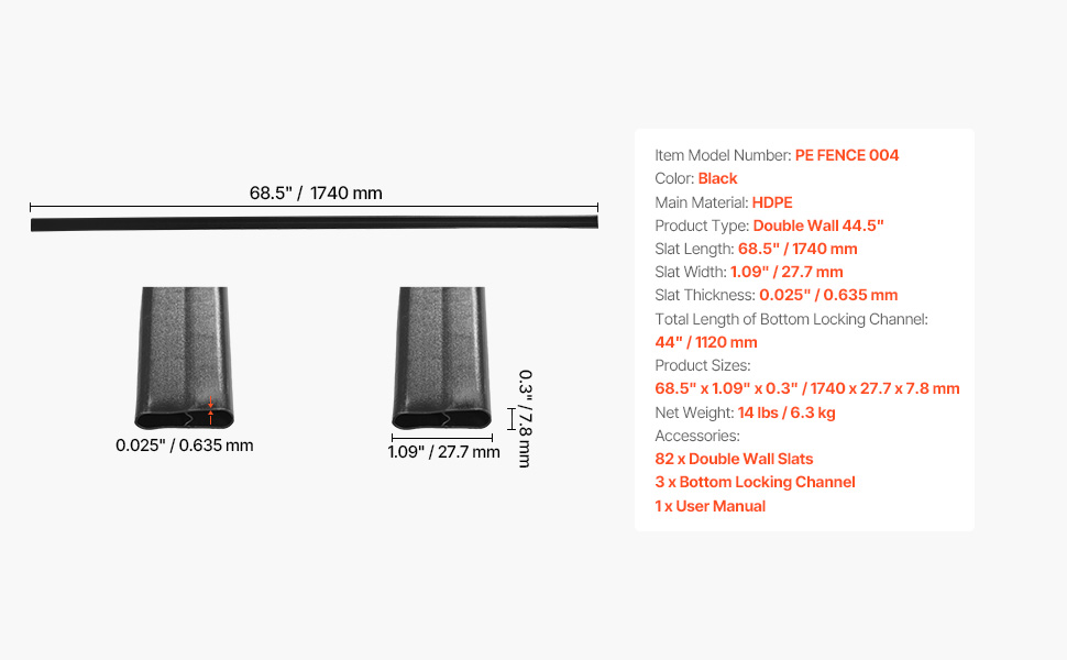 Tieto 68,5" lamely sú určené pre 6' vysoké ploty. Tieto lamely sú vyrobené z HDPE s vysokou hustotou, sú odolné voči poveternostným vplyvom, trvanlivé a ľahko sa inštalujú. Každé balenie obsahuje 82 lamiel a 3 spodné uzamykacie kanály pre 10 ft ploty, ktoré zabezpečujú bezpečné a stabilné uchytenie.