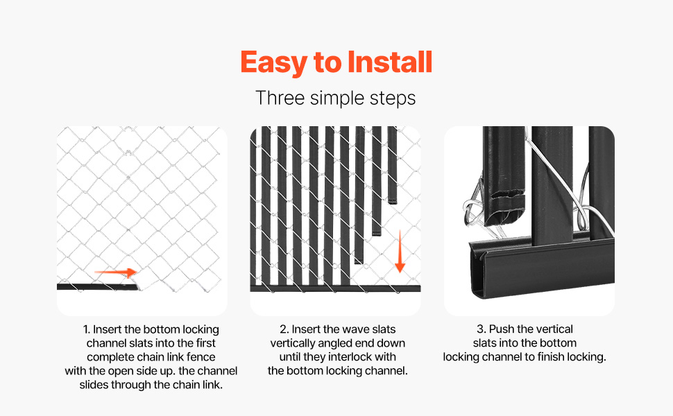 Spodné uzamykateľné lamely na ochranu súkromia vyžadujú len tri jednoduché kroky. Najprv vložte spodné lamely s uzamykacím kanálom do základne plota. Potom posuňte lamely na ochranu súkromia vertikálne nadol a zaistite ich v spodnom kanáli. Inštaláciu plota tak môžete jednoducho dokončiť.