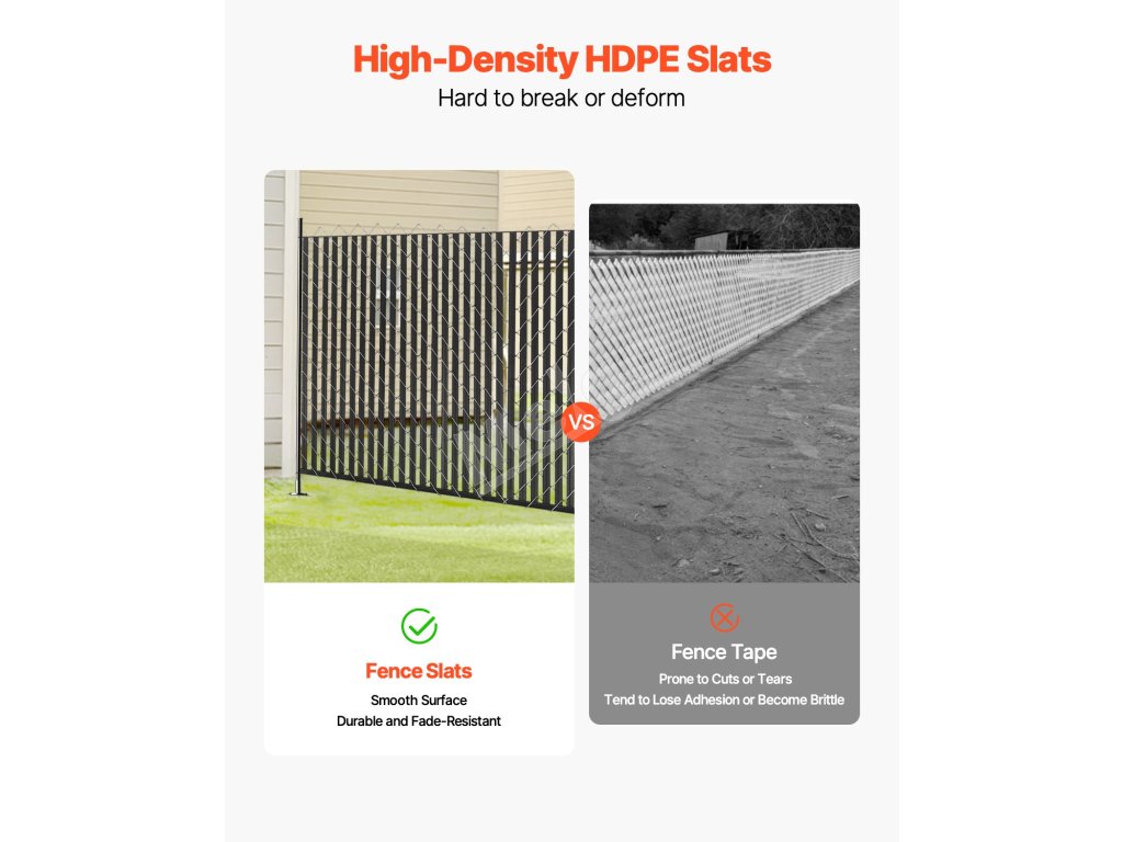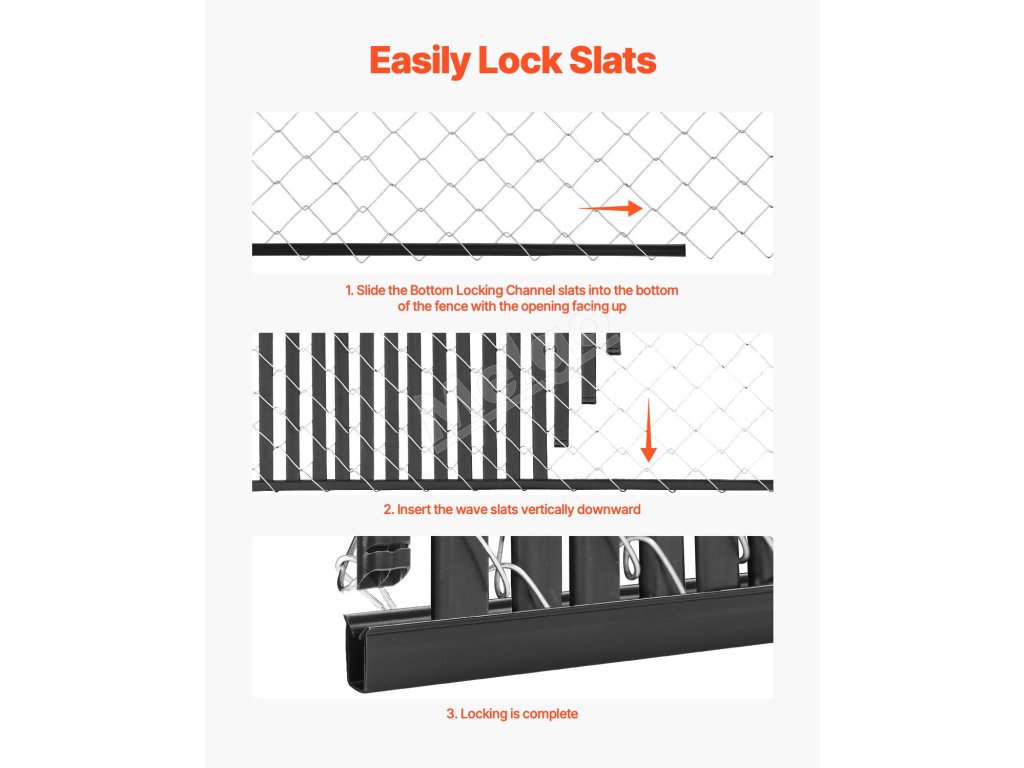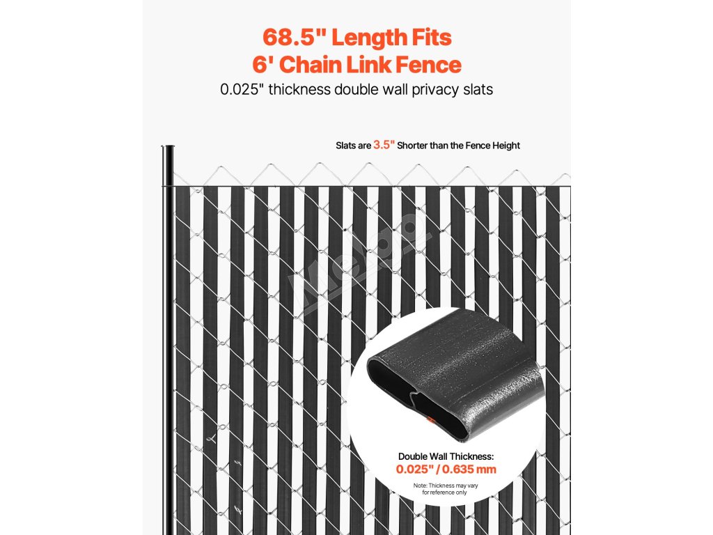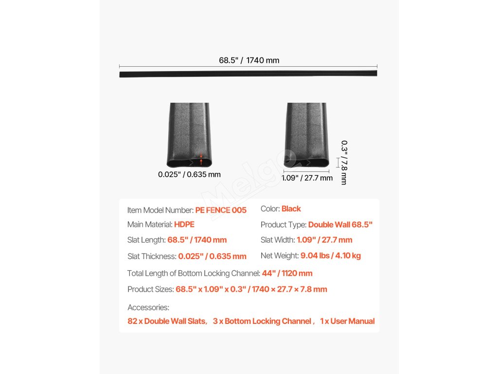 Tieto 68,5" lamely sú určené pre 6' vysoké ploty. Tieto lamely sú vyrobené z HDPE s vysokou hustotou, sú odolné voči poveternostným vplyvom, trvanlivé a ľahko sa inštalujú. Každé balenie obsahuje 82 lamiel a 3 spodné uzamykacie kanály pre 10 ft ploty, ktoré zabezpečujú bezpečné a stabilné uchytenie.