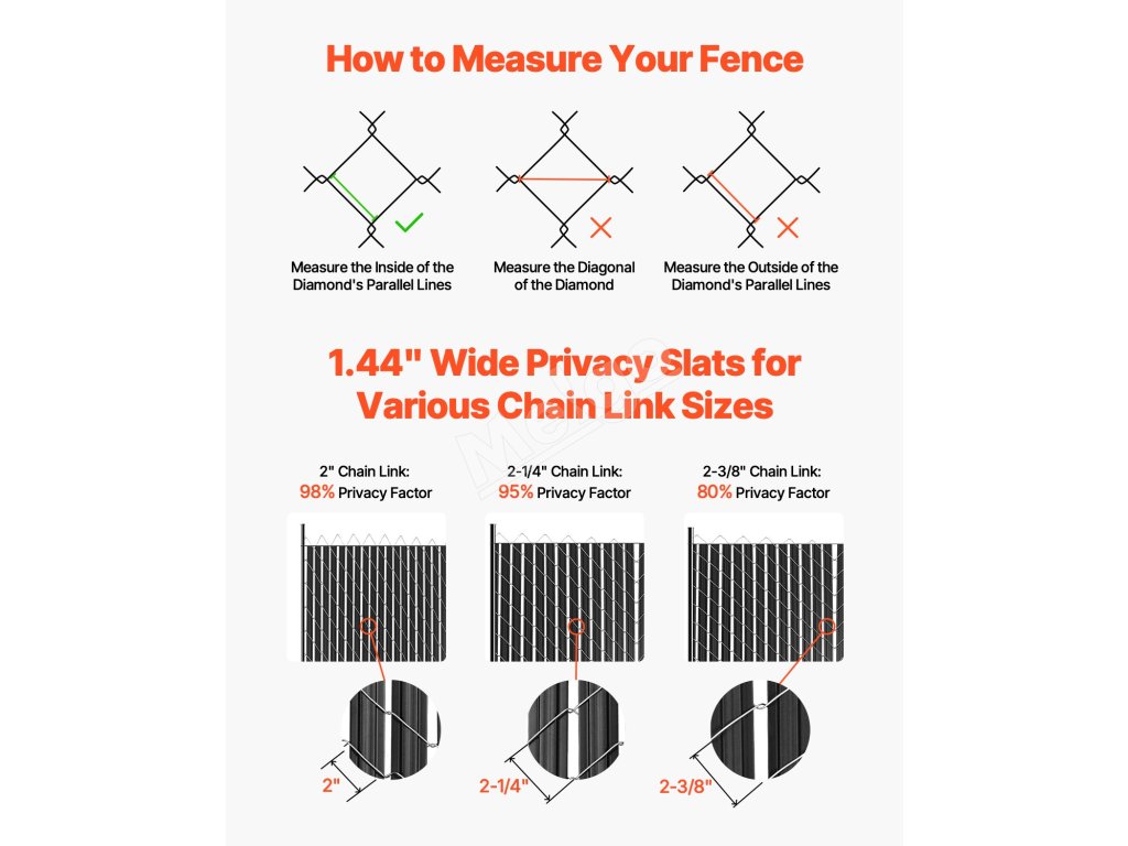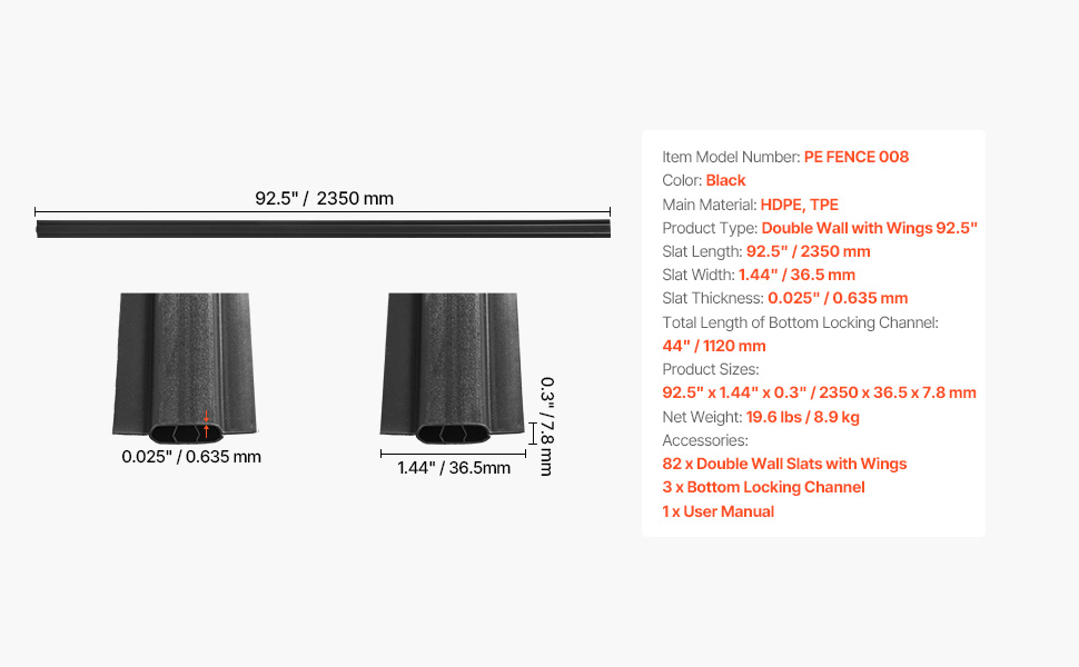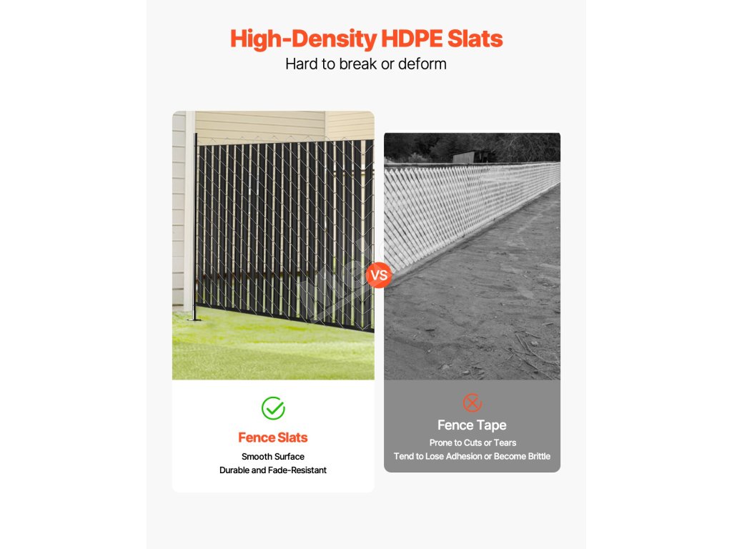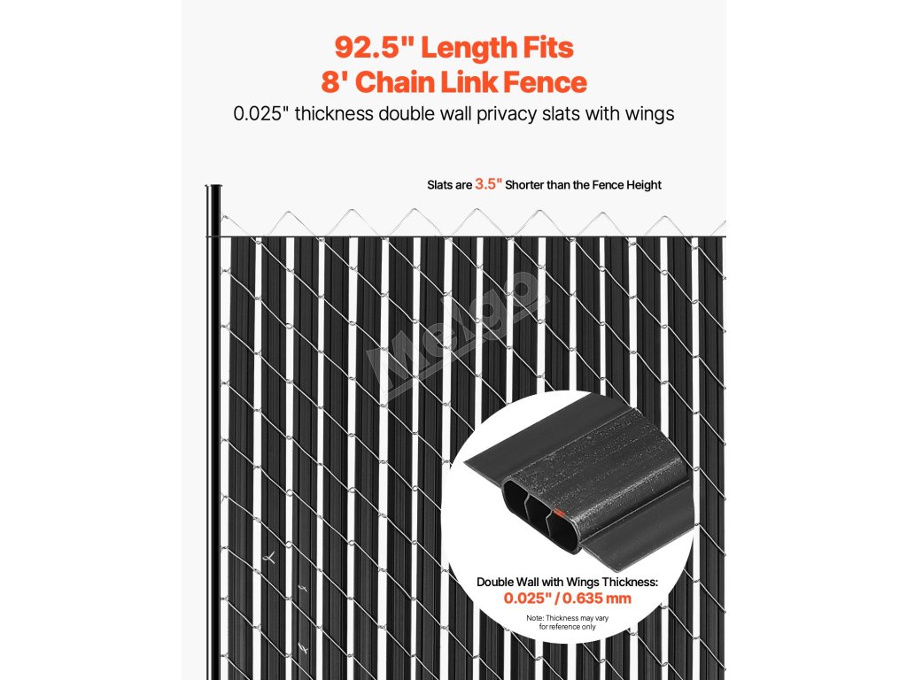 Tieto 92,5" lamely sú určené pre 8' vysoké ploty. Tieto lamely sú vyrobené z HDPE s vysokou hustotou, sú odolné voči poveternostným vplyvom, trvanlivé a ľahko sa inštalujú. Každé balenie obsahuje 82 lamiel a 3 spodné uzamykacie kanáliky pre 10 ft ploty, ktoré zabezpečujú bezpečné a stabilné uchytenie.