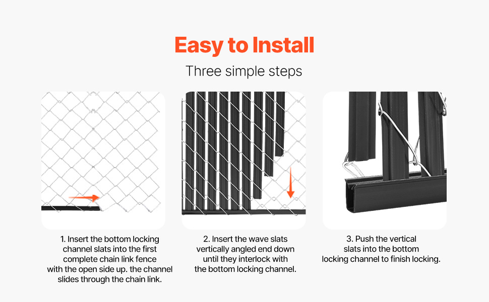 Spodné uzamykateľné lamely na ochranu súkromia vyžadujú len tri jednoduché kroky. Najprv vložte spodné lamely s uzamykacím kanálom do základne plota. Potom posuňte lamely na ochranu súkromia vertikálne nadol a zaistite ich v spodnom kanáli. Inštaláciu plota tak môžete jednoducho dokončiť.