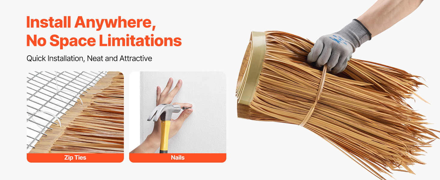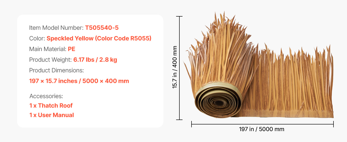 Táto umelá slamená strecha s rozmermi 1,3 × 16,4 ft (0,4 × 5 m) je vyrobená z PE materiálu a ponúka realistický vzhľad s prirodzeným vrstvením. Je vodotesná, vetruvzdorná a odolná voči teplu, preto je ideálna na použitie v interiéri aj exteriéri. Teplom roztaviteľný pás zaručuje odolnosť, ideálny pre strediská, záhrady a projekty pre domácich majstrov.