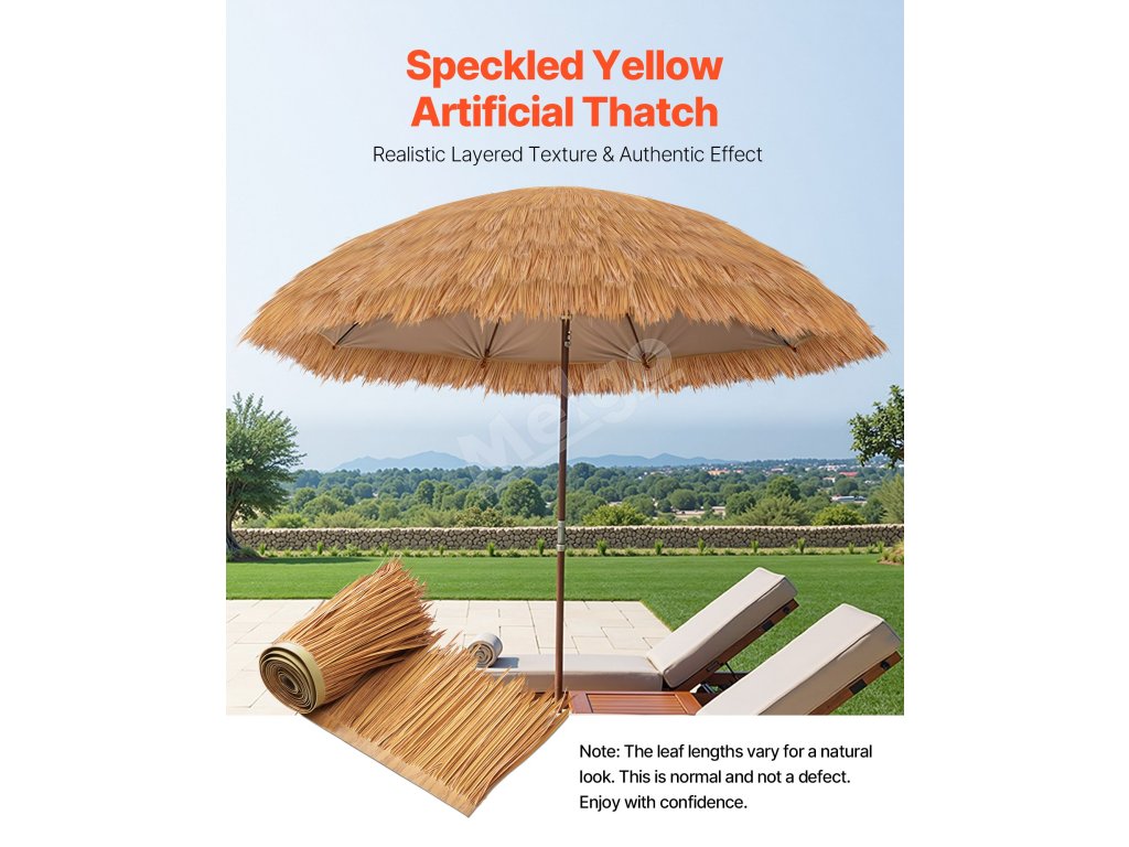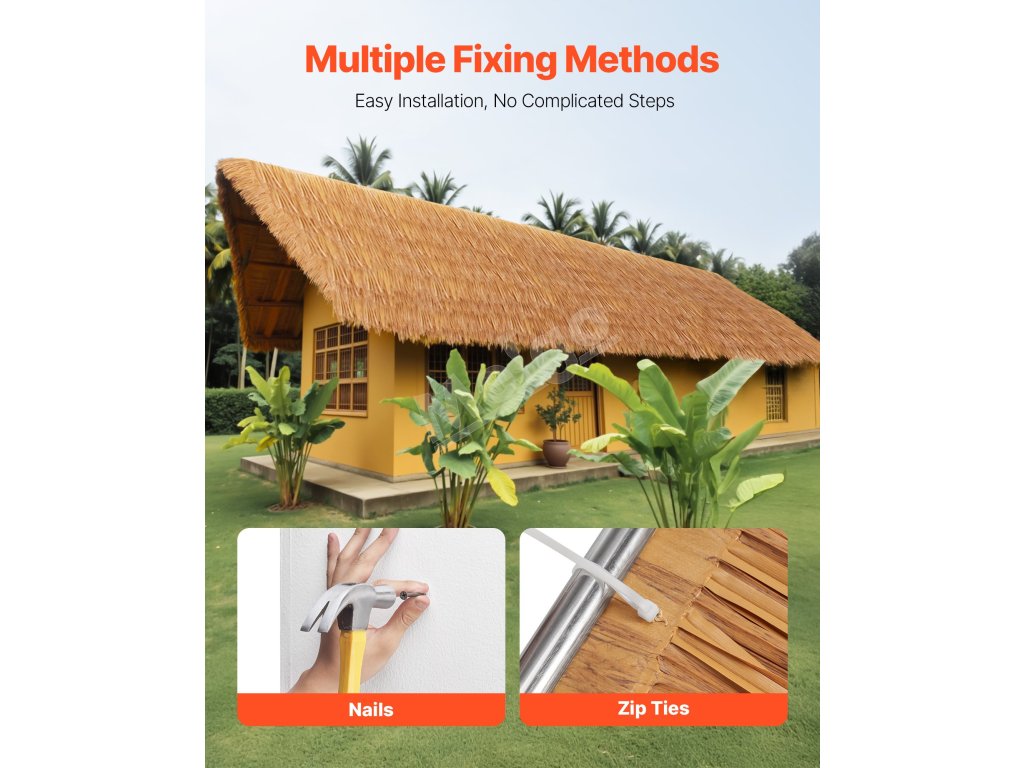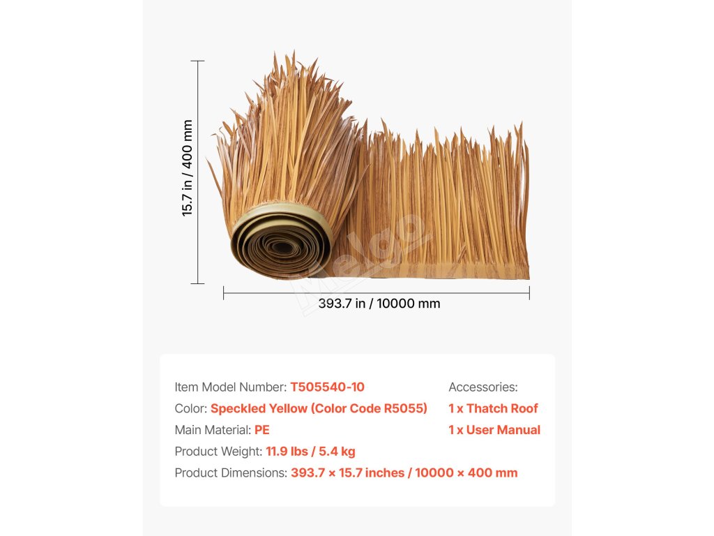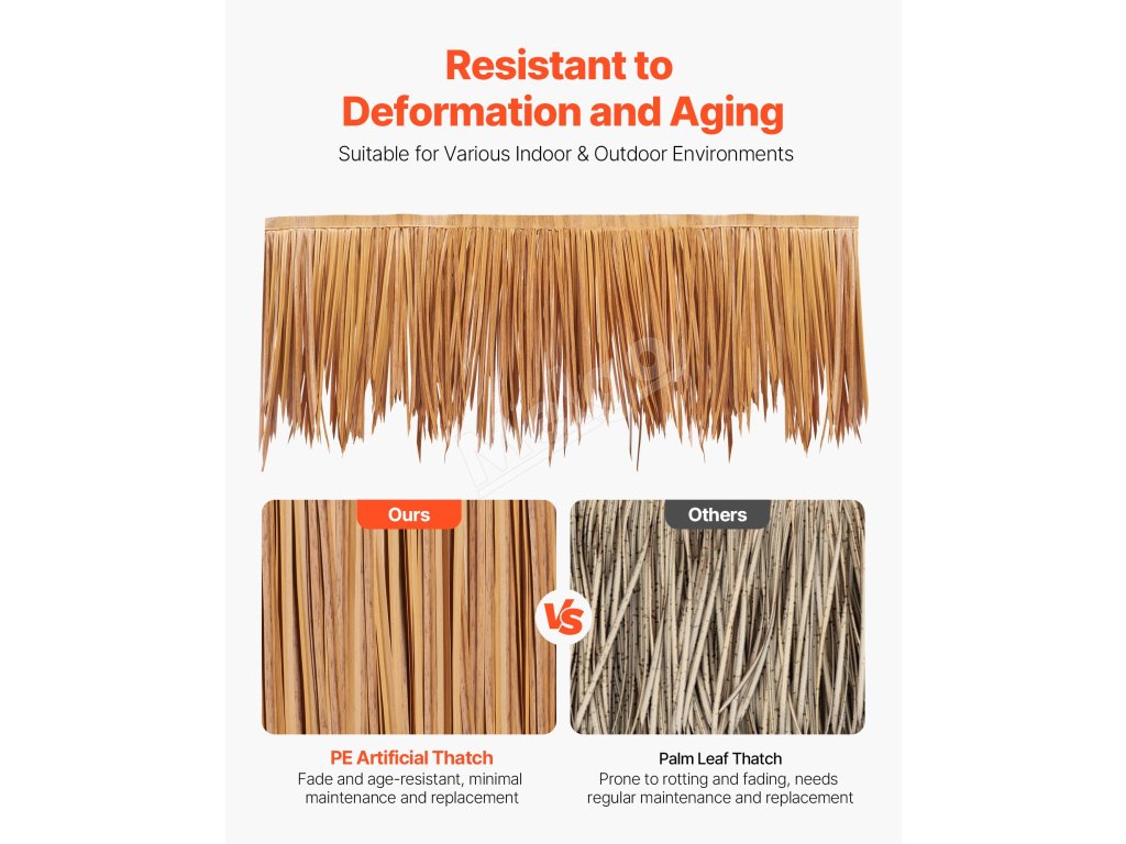 Táto umelá slamená strecha s rozmermi 1,3 × 32,8 stopy (0,4 × 10 m) je vyrobená z PE materiálu a ponúka realistický vzhľad s prirodzeným vrstvením. Je vodotesná, vetruvzdorná a odolná voči teplu, preto je ideálna na použitie v interiéri aj exteriéri. Teplom taviteľný pás zaručuje odolnosť, ideálny pre strediská, záhrady a projekty pre domácich majstrov.
