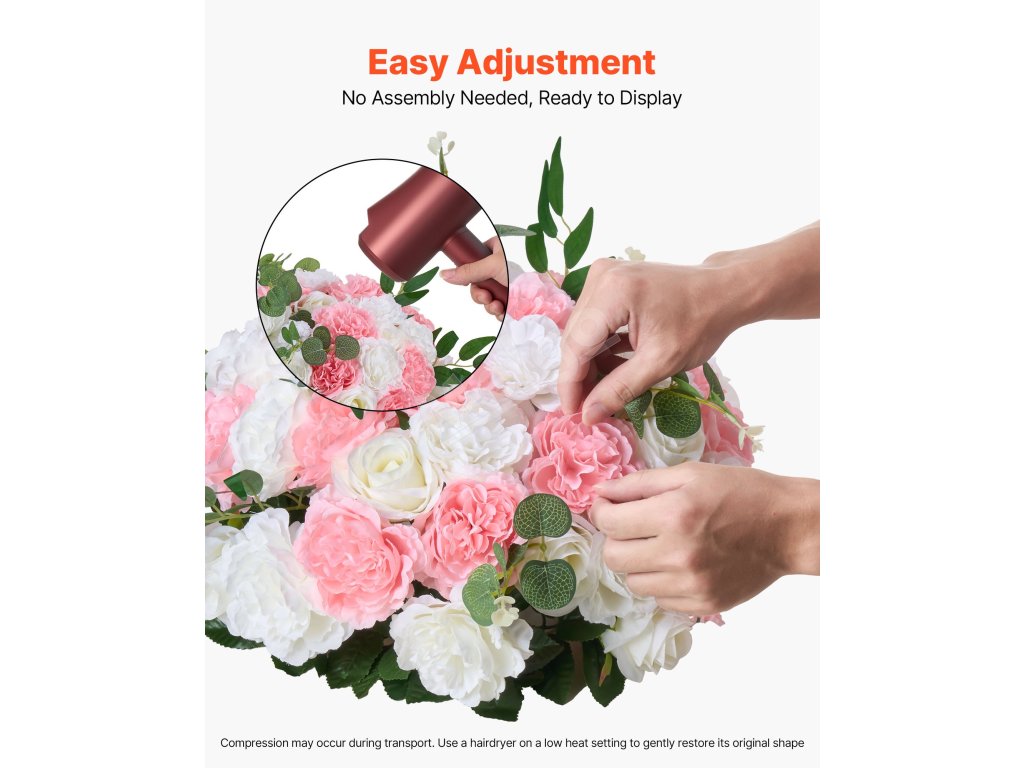 A2: Áno, každá kvetinová guľa je pre vaše pohodlie úplne zmontovaná. Vzhľadom na balenie môže dôjsť k miernemu stlačeniu. Jednoducho použite fén na niekoľko sekúnd na nízku teplotu a jemne rozložte okvetné lístky rukou, aby ste obnovili ich tvar.