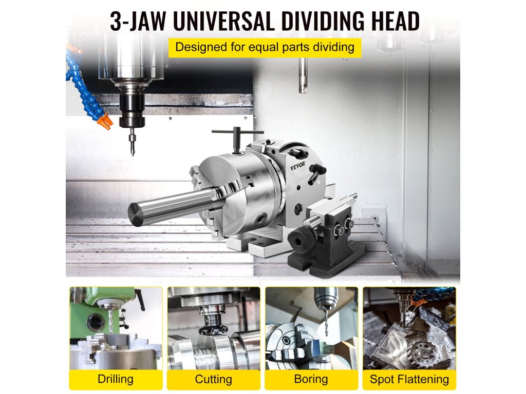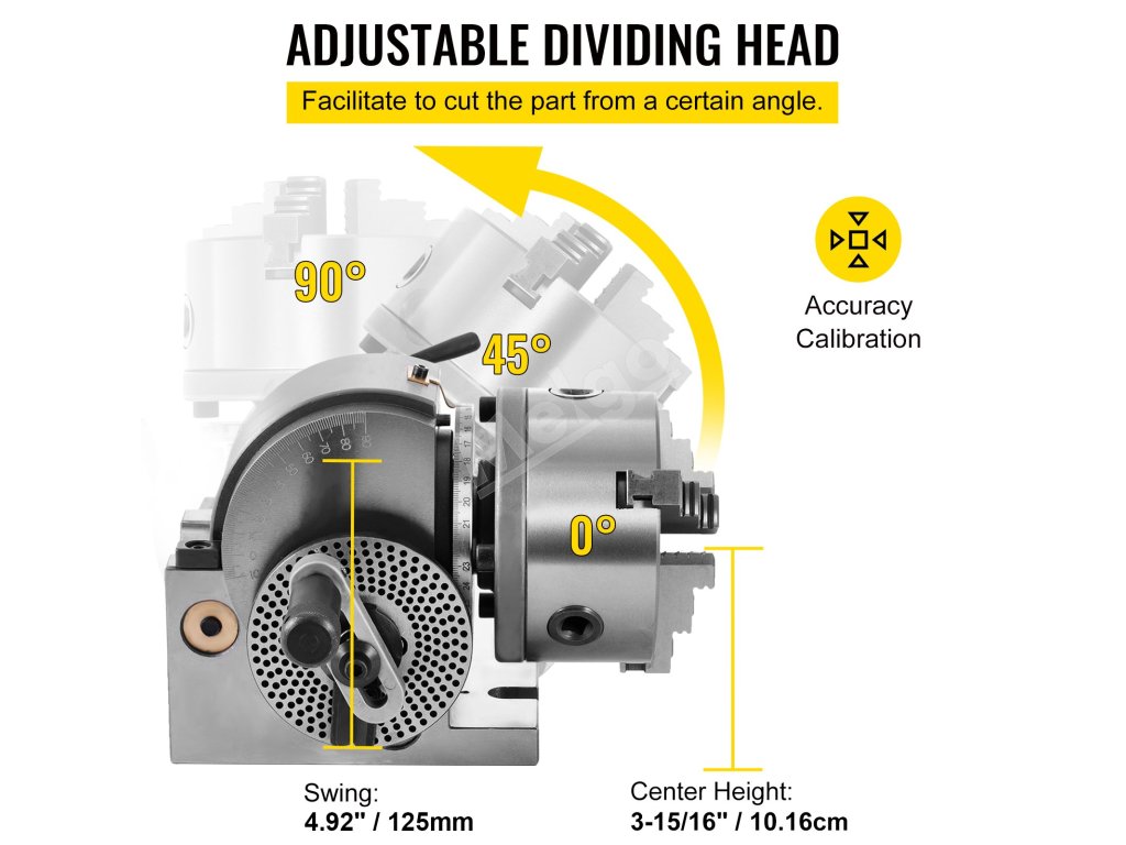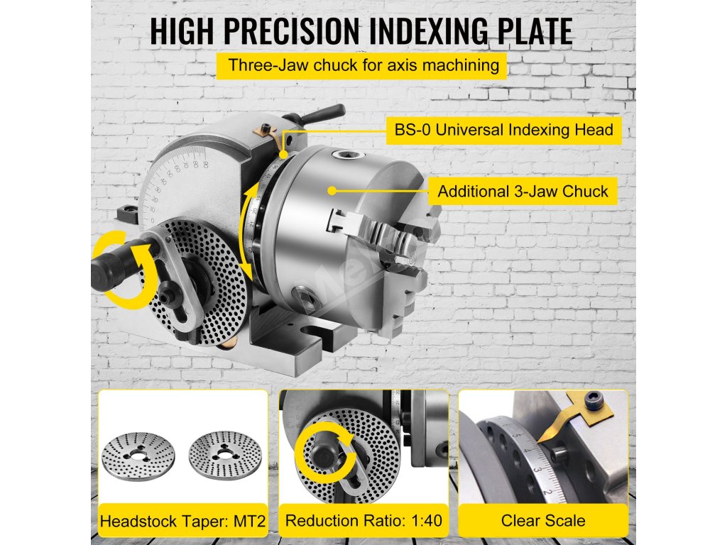 Vysokú presnosť výkonu indexovacej hlavy dosiahnete pomocou nepriamych indexovacích doštičiek A, B a C. Všetky delenia 2-50 možno vykonať, ale niektoré od 51 do 380 nemožno získať. Pred nastavením si pozrite príručku.