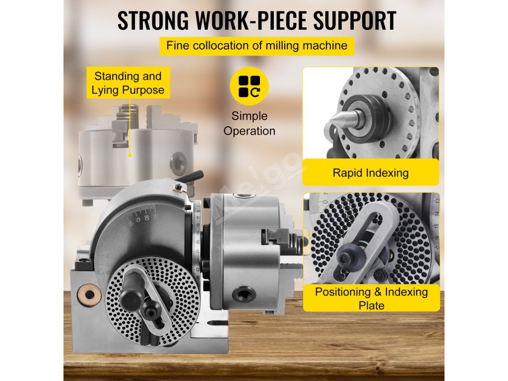 Otáčaním 1. úrovne, ktorá vytláča kolík, kolík prejde do dosky a vy môžete rozdeliť celý kruh na 2, 3, 4, 6, 8, 12 alebo 24 dielov. Druhá úroveň zabraňuje vibráciám vretena počas obrábania.