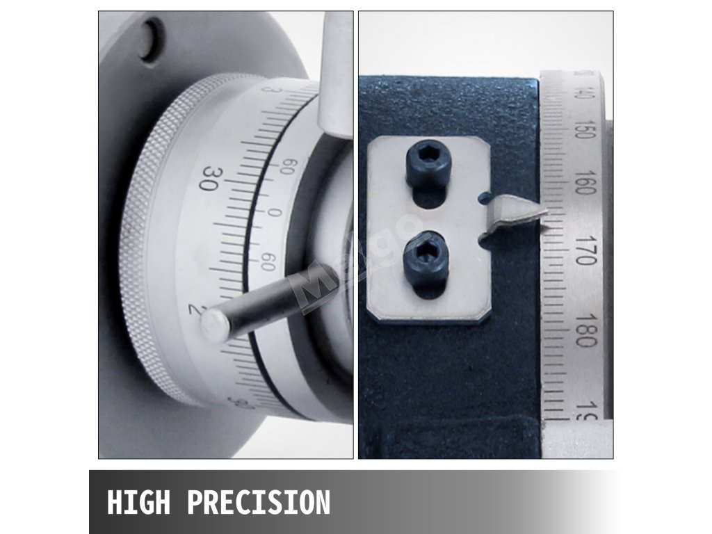 Číselník je rozdelený na celkovo 360 stupňov. Minimálna stupnica môže byť presná na sekundy. To všetko vám pomôže zvládnuť zložitejšie a presnejšie úlohy. Na konci vretena je použité ložisko presnosti. Môžete si byť istí, že sa pri rezaní pod zaťažením udrží veľmi stabilne