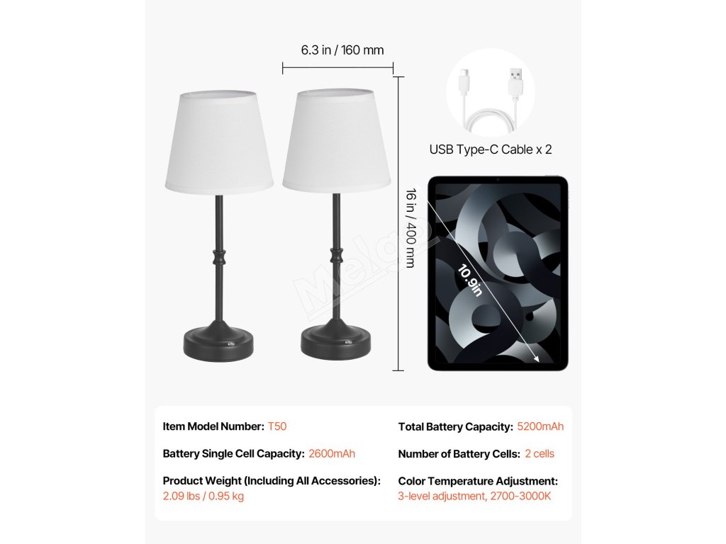 Bezdrôtová stolová lampa 2 ks, 5200mAh, 3-stupne, 2700–3000K, čierna