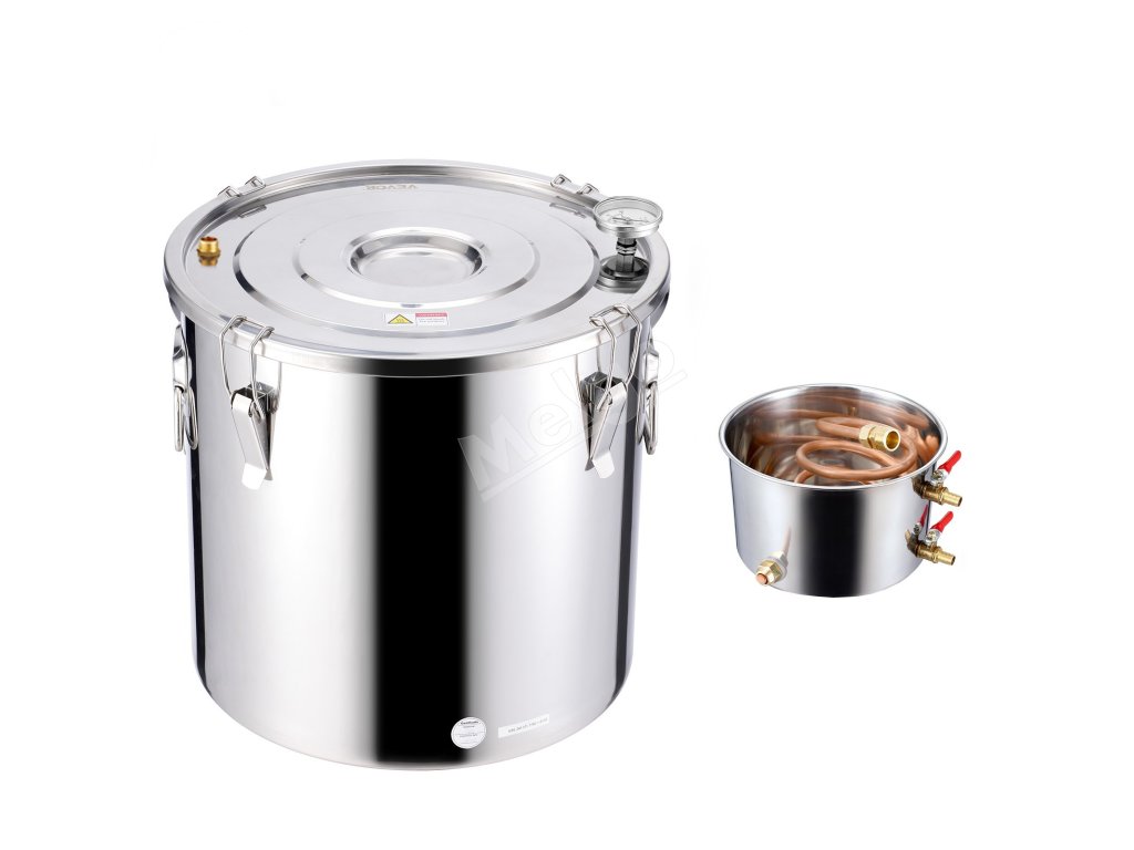 Táto destilačná súprava obsahuje fermentačný sud a chladiacu nádobu, obe vyrobené z potravinárskej nehrdzavejúcej ocele, ktoré zabezpečujú bezpečný kontakt počas celého procesu varenia a destilácie, takže konečný produkt je vhodný na pitie s pokojom.