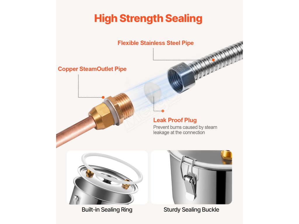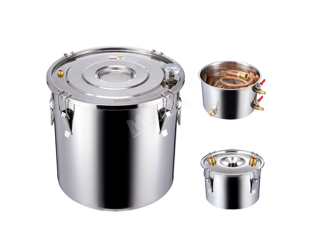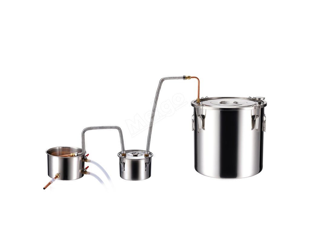 Táto destilačná súprava obsahuje fermentačný sud, sud na pálenie a chladiaci hrniec, ktoré sú vyrobené z potravinárskej nehrdzavejúcej ocele, čo zaručuje bezpečnosť počas celého procesu varenia a destilácie, vďaka čomu je výsledný produkt zdravý na vychutnávanie.