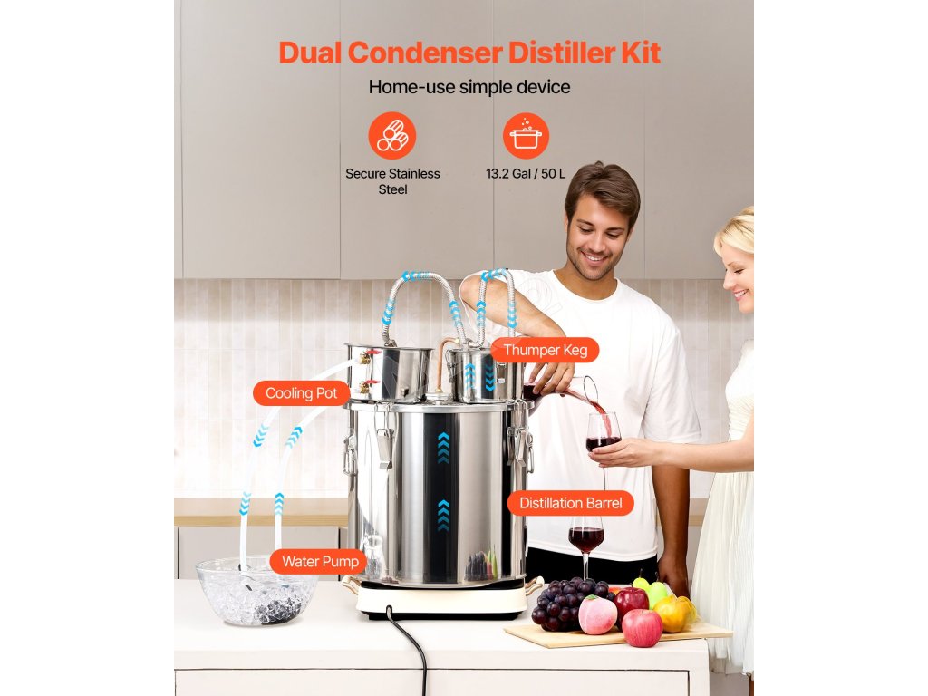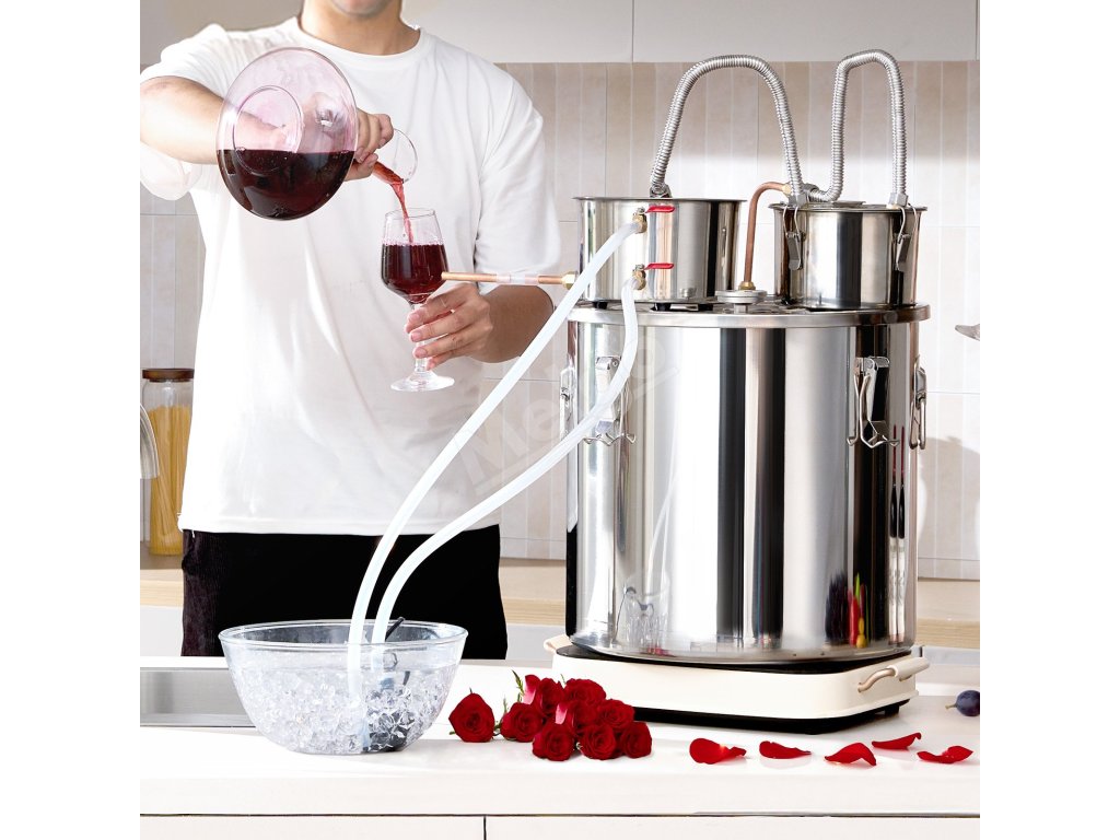V porovnaní s chladiacimi zariadeniami s jedným sudom tento destilačný prístroj pridáva filtračný sud, ktorý umožňuje druhú destiláciu odpareného alkoholu, znižuje nečistoty a zlepšuje chuť podľa vašich preferencií.