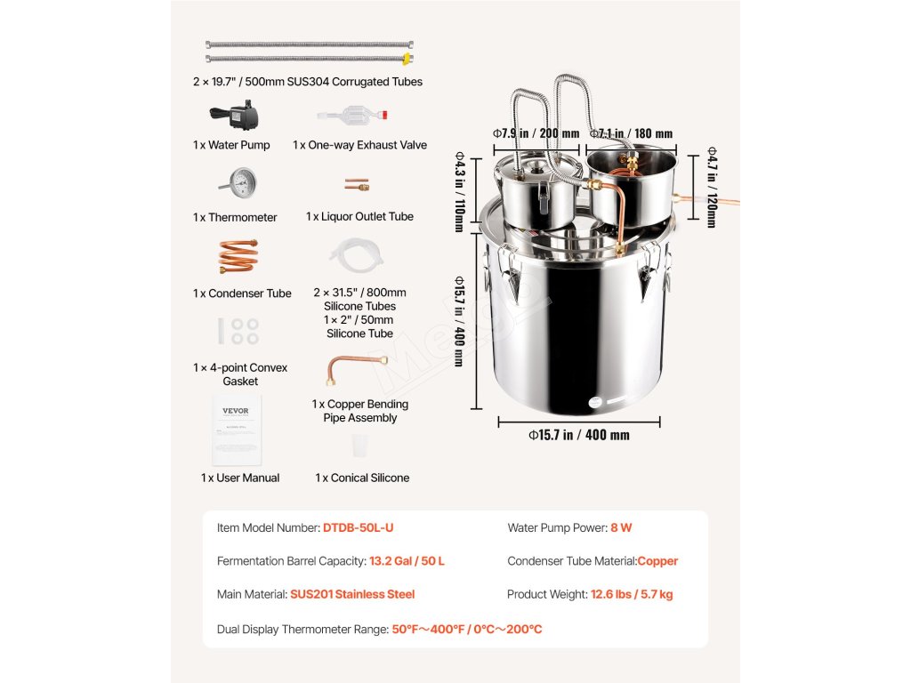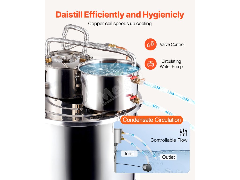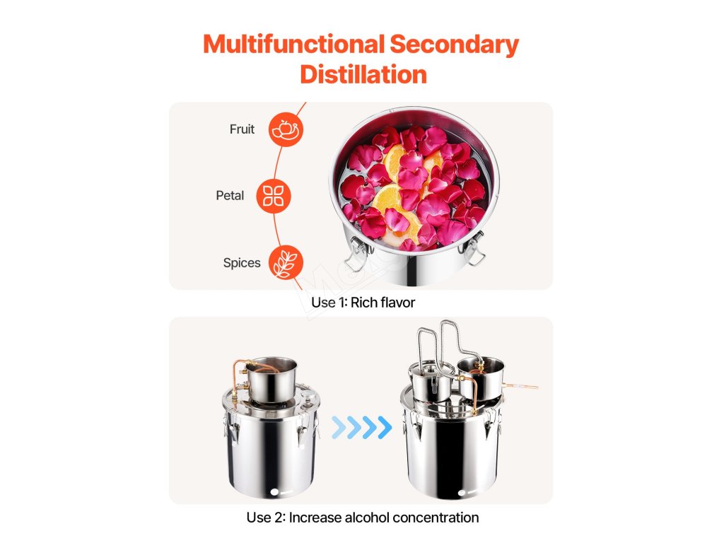 Táto jednoduchá destilačná jednotka je ideálna pre začiatočníkov na varenie a výrobu ovocného vína, rumu, whisky, vodky, destilovanej vody, piva, etanolu a iných destilačných produktov v domácnosti, čím počas sviatkov a stretnutí predvediete svoju úprimnosť a zručnosť.