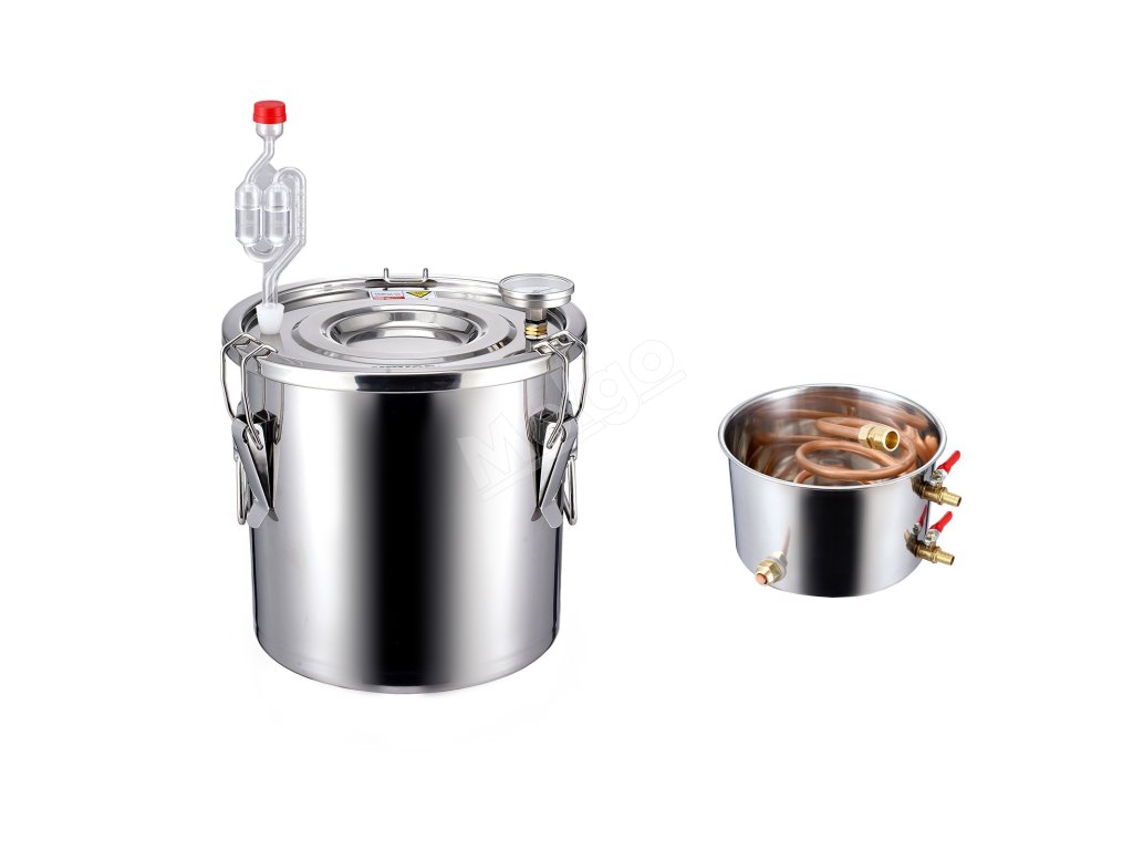 Táto destilačná súprava obsahuje fermentačný sud a chladiacu nádobu, obe vyrobené z potravinárskej nehrdzavejúcej ocele, ktoré zabezpečujú bezpečný kontakt počas celého procesu varenia a destilácie, takže konečný produkt je vhodný na pitie s pokojom.